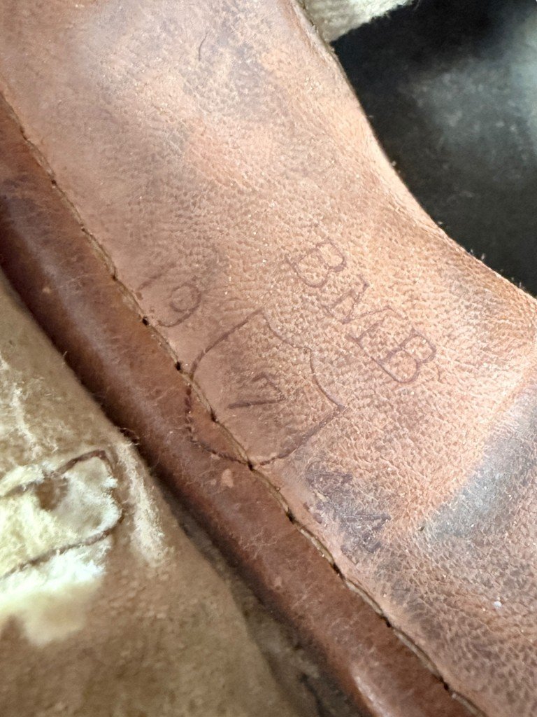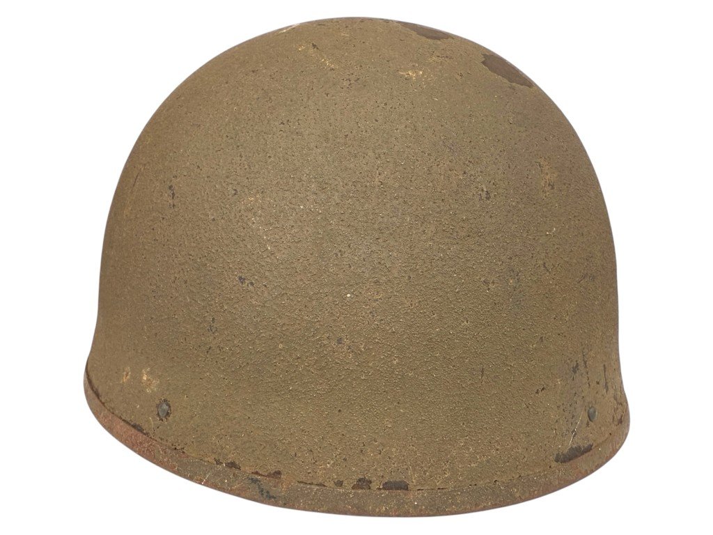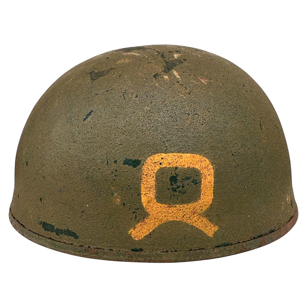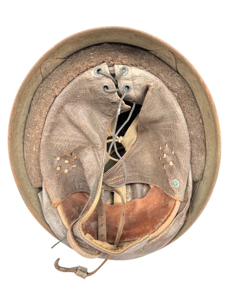 This British Dispatch Rider helmet from 1944 was manufactured by BMB (Briggs Motor Bodies) and was part of the equipment of a Royal Naval Volunteer Reserve (RNVR) Sub-Lieutenant.On both sides, yellow unit insignia have been hand-painted using gas detection paint, a special type of paint that changed color when exposed to poisonous gases.The helmet retains its original rough khaki-grey sand texture and shows clear signs of use, characteristic of genuine wartime service.The interior is complete with a leather liner, felt padding, and the typical webbing adjustment cord found on British motor helmets of that period.British wartime helmets featuring decals are generally harder to find!Article number: 16836