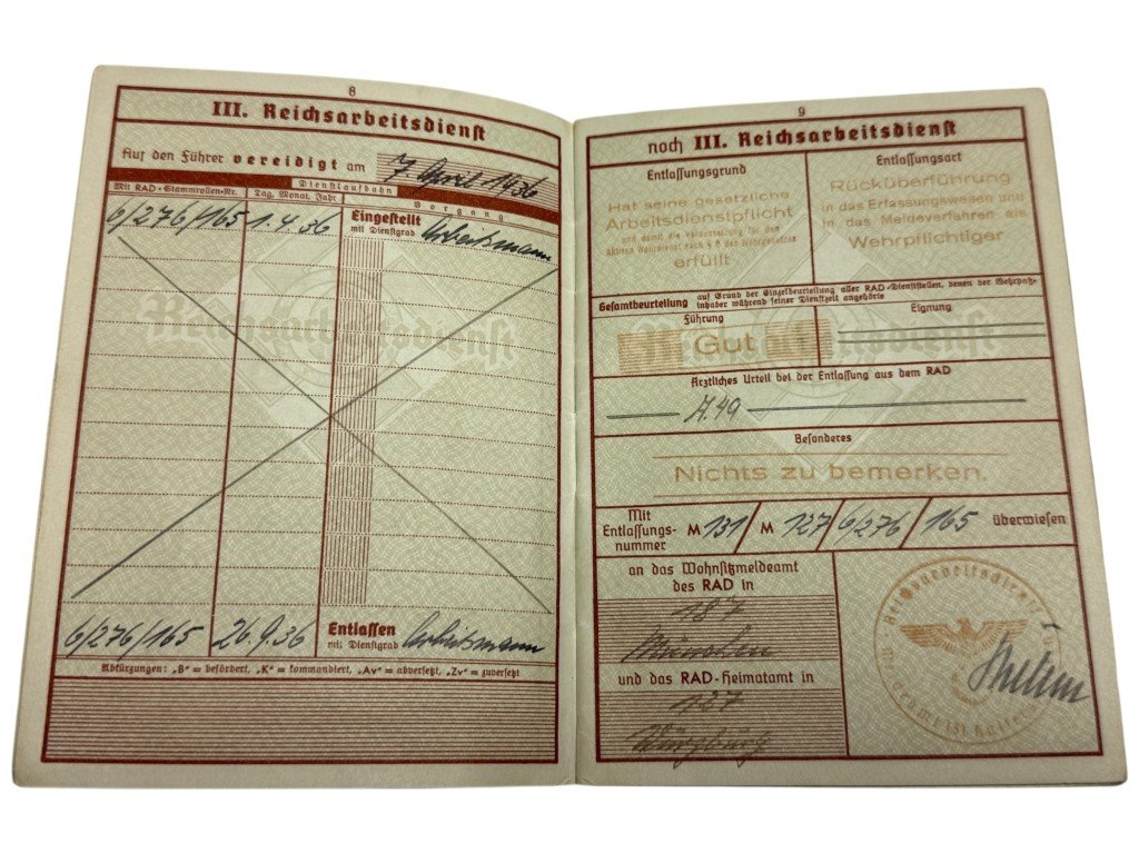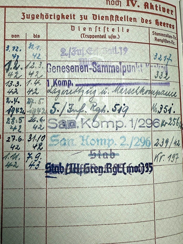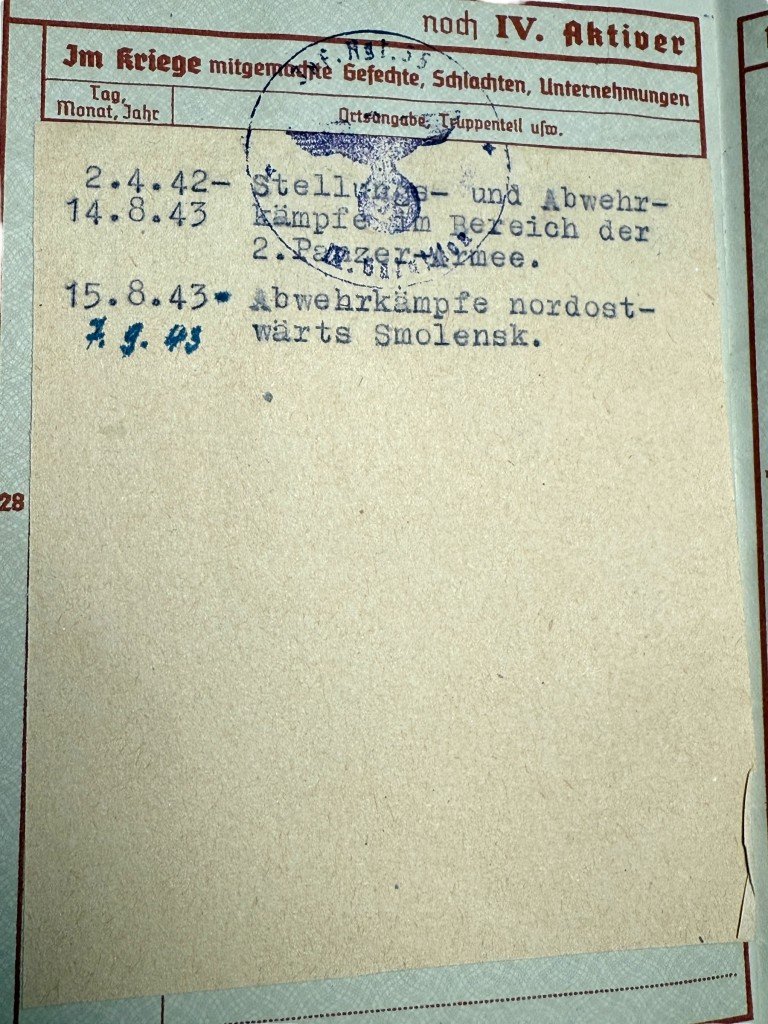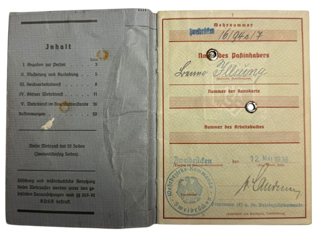This German Wehrpass belonged to Benno Dr. Illsung, born in 1916 in Würzburg, who served during the Second World War as an Unterarzt (military physician) in various medical units (Sanitäts-Kompanien) of the German Wehrmacht.The Wehrpass was issued in 1936 by the Wehrbezirkskommando Speyerbrücken and is fully completed with official stamps, signatures, and the original photograph of Dr. Illsung.According to the entries, Illsung served with Sanitäts-Kompanie 1./296, Sanitäts-Kompanie 2./296, and later with the Stab/III Grenadier-Regiment (mot.) 35, a motorized infantry regiment that was part of the 2nd Panzer Army on the Eastern Front.He took part in prolonged positional and defensive battles in this area, including the heavy fighting around Smolenskduring the summer of 1943.The Wehrpass records several promotions and decorations, including the Iron Cross 2nd Class and the Wound Badge in Black, both awarded in August 1943.According to the final entry, Benno Dr. Illsung was killed in action on September 7, 1943, near Smolensk, as a result of shrapnel wounds to the upper shoulder and chest.Today, he is buried at the German Military Cemetery Smolensk–Nishnjaja Dubrowinka, where his grave can still be found. His name is also listed in the online database of the Volksbund Deutsche Kriegsgräberfürsorge (Volksbund.de).The Wehrpass remains in very good and complete condition, with all 52 pages present, containing numerous original handwritten entries, unit listings, official stamps, and signatures.This document offers a powerful and personal insight into the military career and fate of a young Wehrmacht physician on the Eastern Front.Article number:16837Originele WWII Duitse WH Unterarzt Wehrpass gesneuveld bij SmolenskDeze Duitse Wehrpass behoort toe aan Benno Dr. Illsung, geboren in 1916 in Würzburg, die tijdens de Tweede Wereldoorlog diende als Unterarzt (militair arts) in verschillende Sanitäter-eenheden van de Duitse Wehrmacht.De Wehrpass werd uitgegeven in 1936 door het Wehrbezirkskommando Speyerbrücken en is volledig ingevuld met officiële stempels, handtekeningen en de originele pasfoto van Dr. Illsung.Uit de aantekeningen blijkt dat Illsung diende bij onder meer de Sanitäts-Kompanie 1./296, de Sanitäts-Kompanie 2./296, en later bij de Stab/III Grenadier-Regiment (mot.) 35, een gemotoriseerde infanterie-eenheid die deel uitmaakte van de 2. Panzerarmee aan het Oostfront.Hij nam deel aan langdurige stellingsoorlogen en afweergevechten in dit gebied, waaronder de zware gevechten rond Smolensk in de zomer van 1943.De Wehrpass vermeldt meerdere bevorderingen en onderscheidingen, waaronder het Eiserne Kreuz II. Klasse en het Verwundetenabzeichen in Schwarz, beide toegekend in augustus 1943.Volgens de laatste vermelding is Benno Dr. Illsung op 7 september 1943 gesneuveld bij Smolensk, als gevolg van granaatscherfwonden aan de bovenschouder en borstkas.Tegenwoordig ligt hij begraven op de Duitse militaire begraafplaats Smolensk–Nishnjaja Dubrowinka, waar zijn graf nog altijd te vinden is.Zijn naam is ook geregistreerd in de online databank van de Volksbund Deutsche Kriegsgräberfürsorge (Volksbund.de).De Wehrpass verkeert in zeer goede, complete staat, met alle 52 pagina's aanwezig en volledig gevuld met originele aantekeningen, eenheden, stempels en handtekeningen.Deze pas biedt een indrukwekkend en persoonlijk inkijkje in de militaire loopbaan en het lot van een jonge Wehrmacht-arts aan het Oostfront.