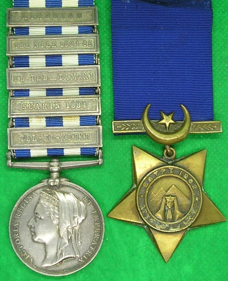 5 BAR EGYPT PAIR, 1st ROYAL HIGHLANDERS / BLACK WATCH, SHOT THROUGH HIS HELMET AT KIRBEKAN 1885