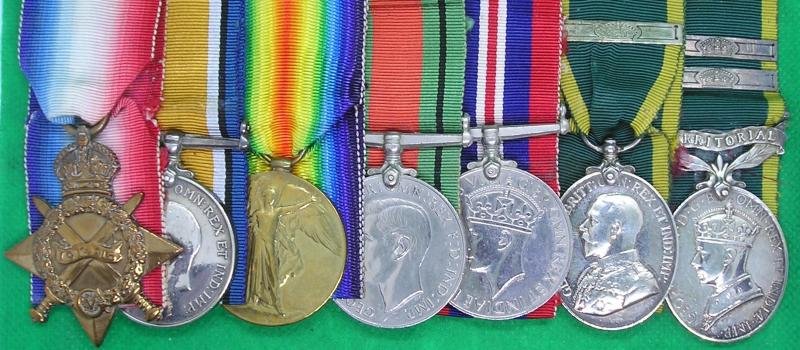 A superb long service group to a long serving senior warrant officer of the Leeds Rifles1914-15 trio, WW2 Defence & War Medals, GVR Territorial Force Efficiency medal with 2nd award bar & GVIR Efficiency medal with Territorial suspender & two 2nd award barsTo- 716.SJT.J.HOTCHKISS.W.YORK.R (Star)716.WO.CL.2.J.HOTCHKISS.W.YORK.R (Pair)2605020.C.QM.SJT.J.HOTCHKISS.7/W.YORK.R4523196.WO.CL.2.J.HOTCHKISS.R.TKS (TEM)Joseph Hotchkiss first landed in France 16-4-1915 serving with the 1/7th battalion of the West Yorkshire Regiment / Leeds Rifles. He was listed as having been wounded in the casualty list dated 31-7-1915 & was awarded his Territorial Force efficiency medal in army order 275 of 1919 & his clasp was awarded in the same army order. He was still serving with the battalion when it became the 45th (Leeds Rifles) battalion Royal Tank Regiment in 1939. He was awarded the efficiency medal with territorial suspender in 1947 & was commissioned in to the R.A.C in 1940.Lightly polished GVF/VF with conformation of all medals & clasps. Along with London gazette details for his commission & two copy group photographs of the recipient in uniform dated 1939.
