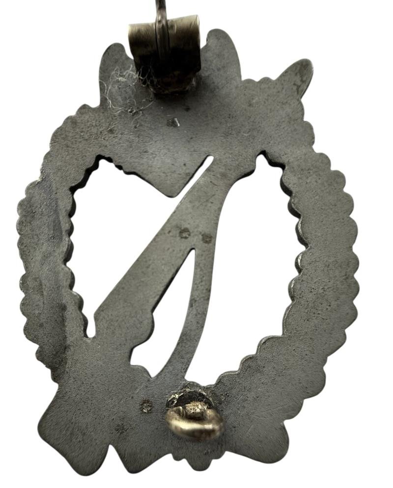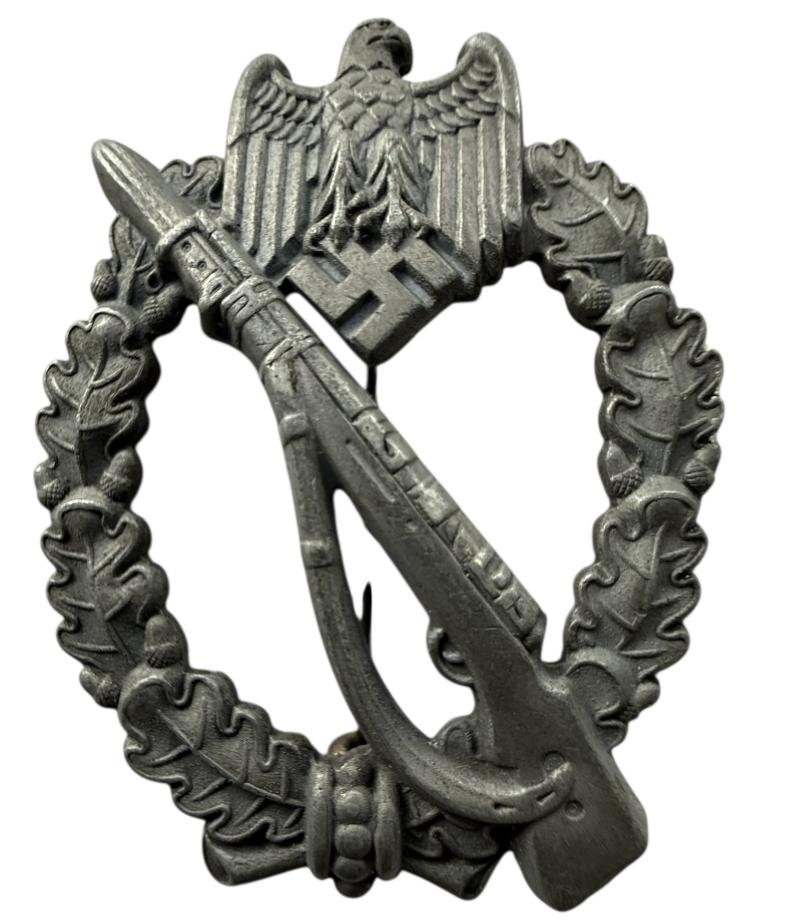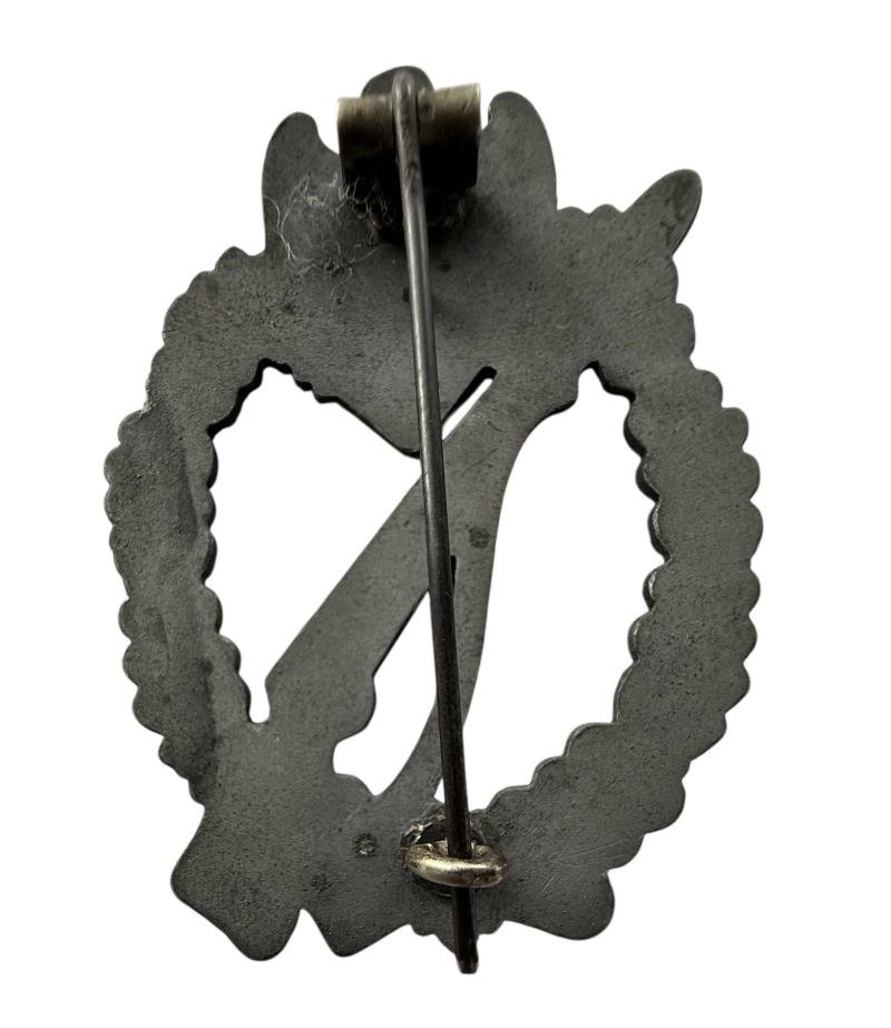 Infantry Assault Badge in Silver (Infanterie Sturmabzeichen in Silber). The badge is executed in 'Feinzink' and applied with original silver finish. The badge is not visible maker marked. In overal nice used condition.