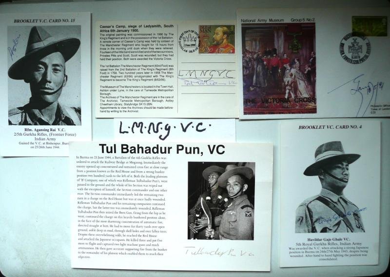 From the collection of the late Graham Booth, who was a fanatical collector of all things Gurkha. It includes the original signatures of:1) Rifleman Tulbahadur Pun, VC (6th Gurkha Rifles)2) Rifleman Againsing Rai, VC (2/5th Gurkha Rifles)3) L. M. N.G. VC (Believed to be RiflemanLachhiman Gurung, 8th Gurkha Rifles)4) Halivadar Gaje Ghale, VC (5th Gurkha Rifles)Six items in total including two scarce Brooklet VC cards signed by the recipients and two postal covers. Some wear from removal from album otherwise in good condition overall and rare.Comm EdBr