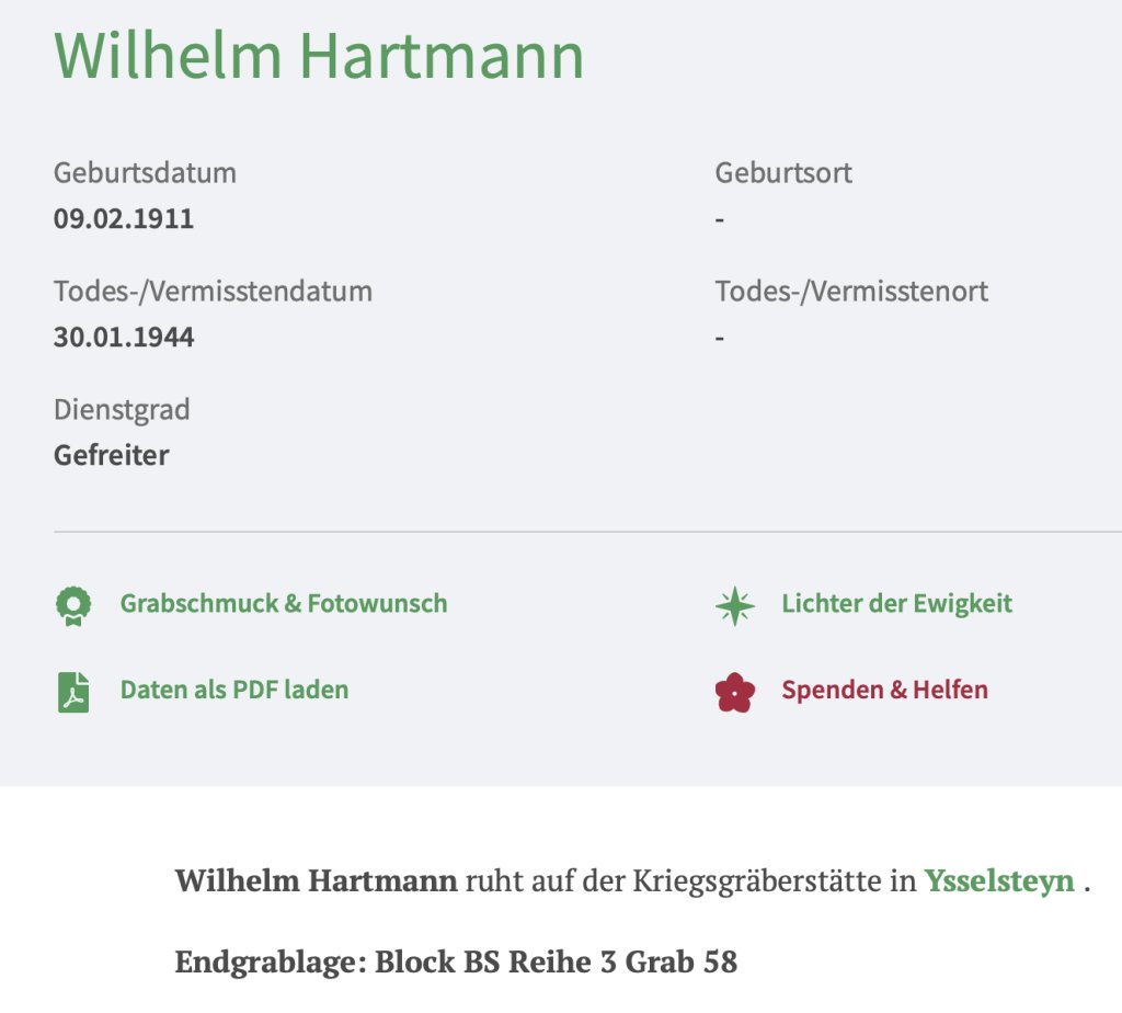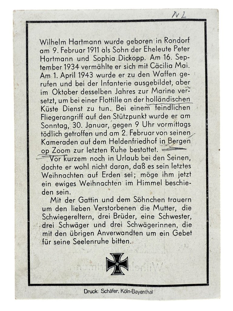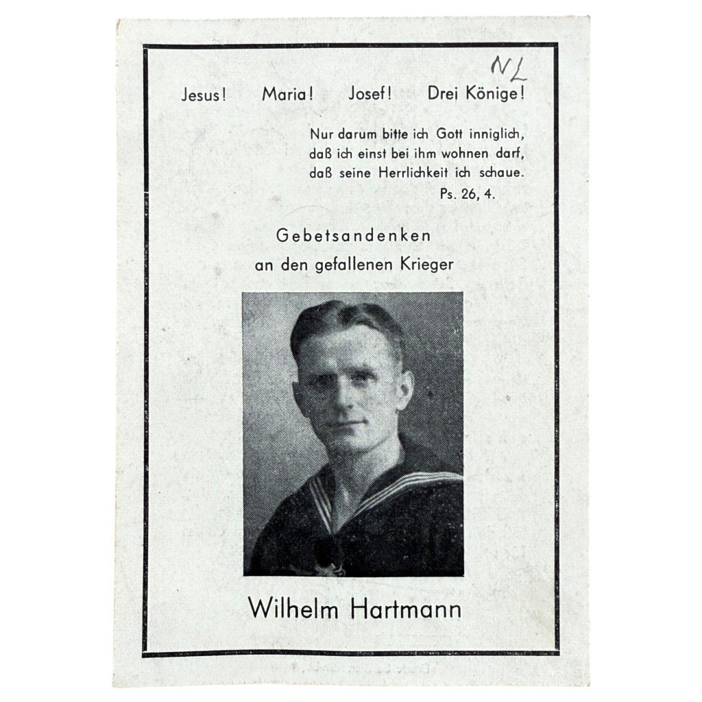 This German death card commemorates Wilhelm Hartmann, a sailor of the Kriegsmarine, who was killed on January 30, 1945, during an Allied air raid on the base near Bergen op Zoom.The death card mentions his birth on February 9, 1911, in Rondorf, his marriage to CΓ€cilia Mai in 1934, and his military career, from the infantry to the navy, where he served along the Dutch coast.The front features a portrait of Hartmann in uniform with the text 'Gebetsandenken a den gefallenen Krieger' ('Prayer remembrance for the fallen soldier').He is now buried at the German War Cemetery in Ysselsteyn and can be found on the German war graves website Volksbund.de.Article number: 16840