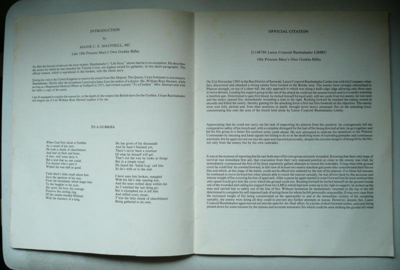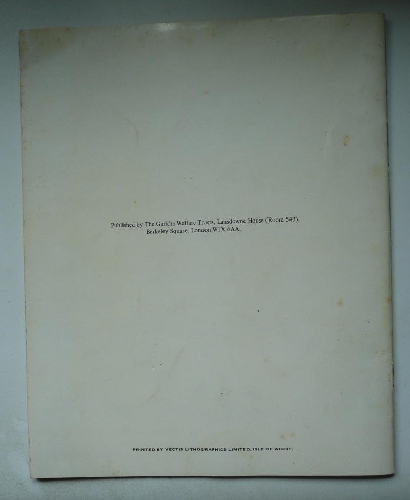A soft cover booklet published by The Gurkha Welfare Trusts, undated but has some age to it, slight foxing to front inner page which as been signed by the author. Circa 20 pages, including 4 pages of black and white photographs. In good used condition with no pen marks other than the signature of the author, damage or tears. Scarce.Comm EdBr