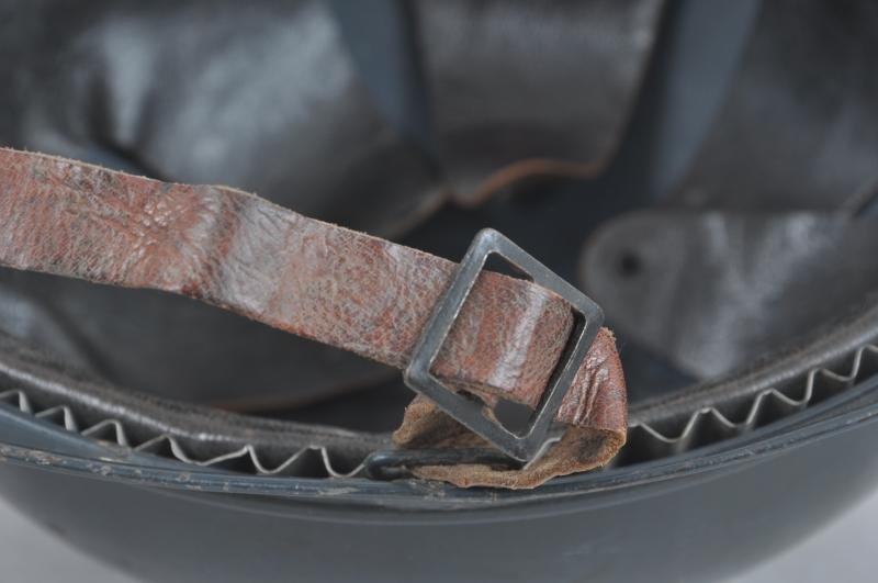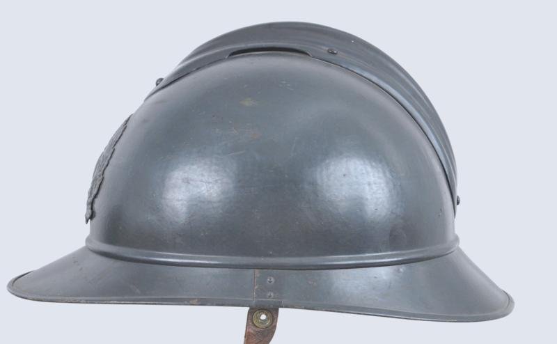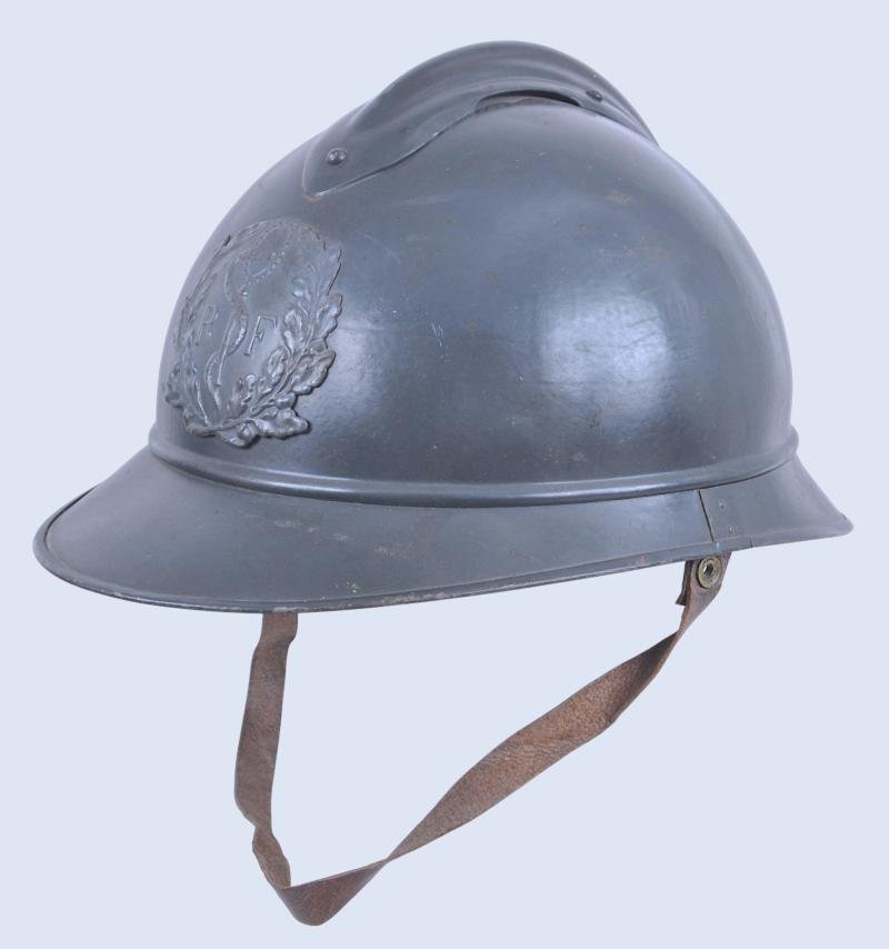 A rare French M15 Adrian helmet for medical personnel in near mint condition & in a very large size.Totally untouched , this helmet displays the distinctive medical insignia to front of Caduceus with the serpent of Epidaurus encircling the mirror of prudence . This is flanked by the letters 'RF' & surrounded by a laurel & oakleaves in its entirety. This insignia was adopted in August 1915 when the War Ministry recommended issuing the helmet to medics & doctors. It is clear that the badge is totally original to the helmet with its holding pins to reverse totally undisturbed. The helmet shell retains an exceptionally high proportion of its factory blue paint with lining in the early one piece first pattern . Head band of the liner is in good order with corrugated metal strips to each side for ventilation present. Complete with intact original chinstrap this is a rare helmet that has survived in near mint condition.