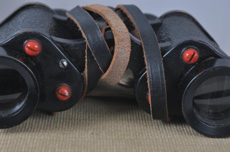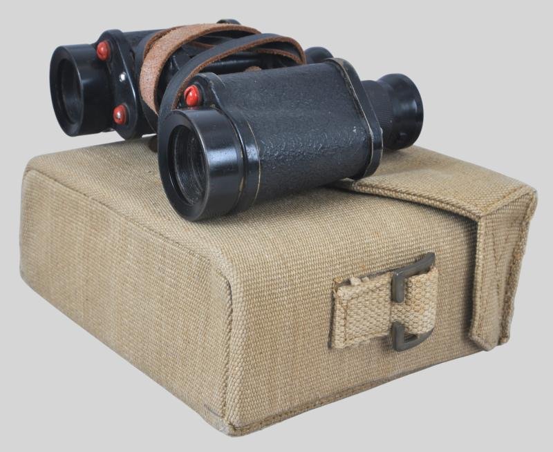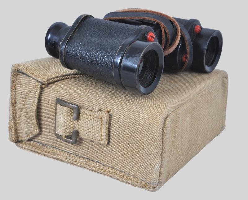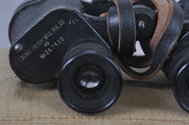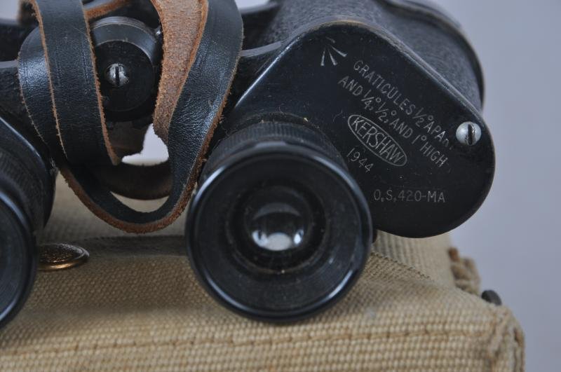 A pair of X6 british No.2 MkIII binoculars dated 1944 , classic WW2 British army issue.Broad arrow marked & made by 'Kershaw' with red screw points to bottom which indicates the presence of anti misting gas. Come with '37 pattern webbing case dated 1941.