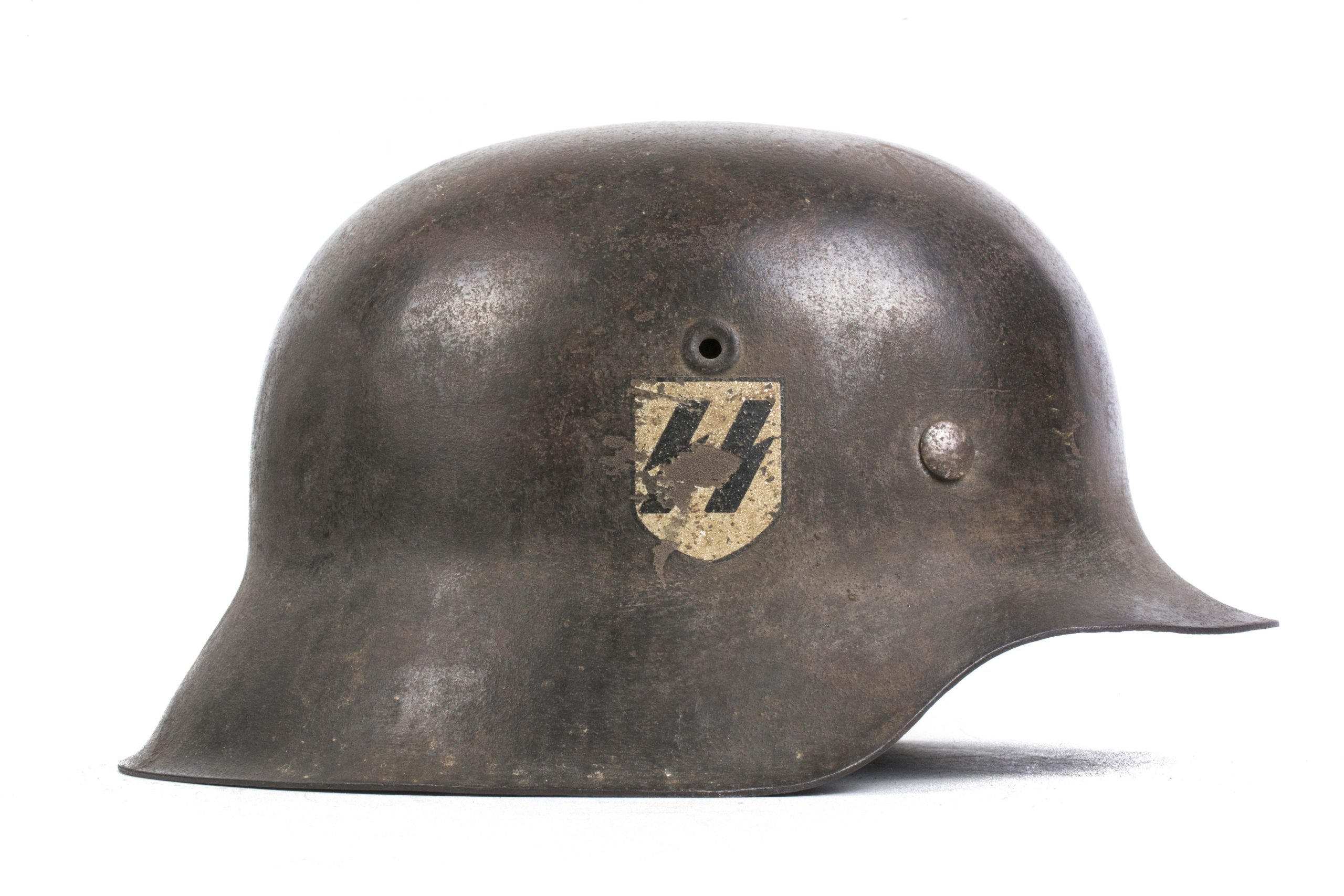 RareWaffen-SSM42 combat helmet markedEF64indicating production byEmaillierwerke Fulda.The helmet bears its textbookEF SSdecal and paint retaining up to 80%. The helmet is size 64 shell with its factory installed liner and partial chinstrap. The helmet is a typical late war example of a nowadays hard to find originalWaffen-SShelmet!