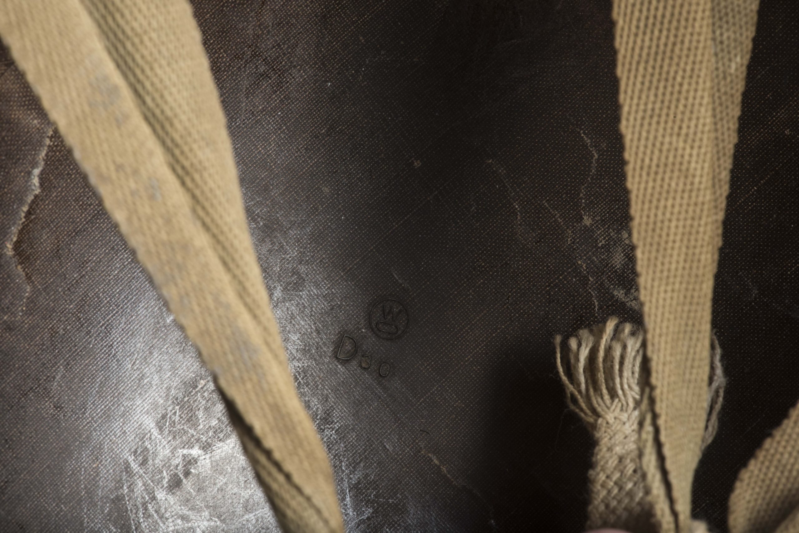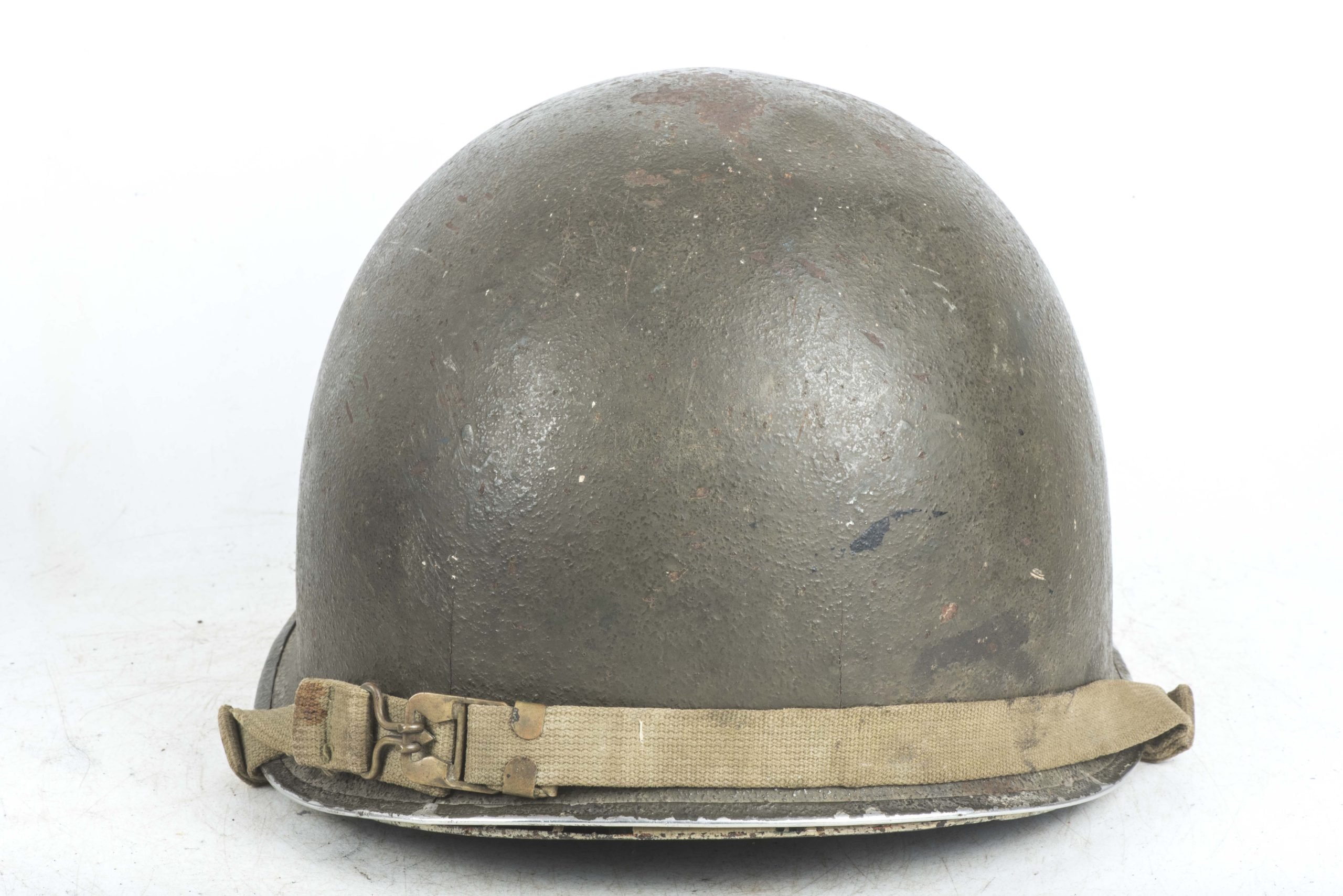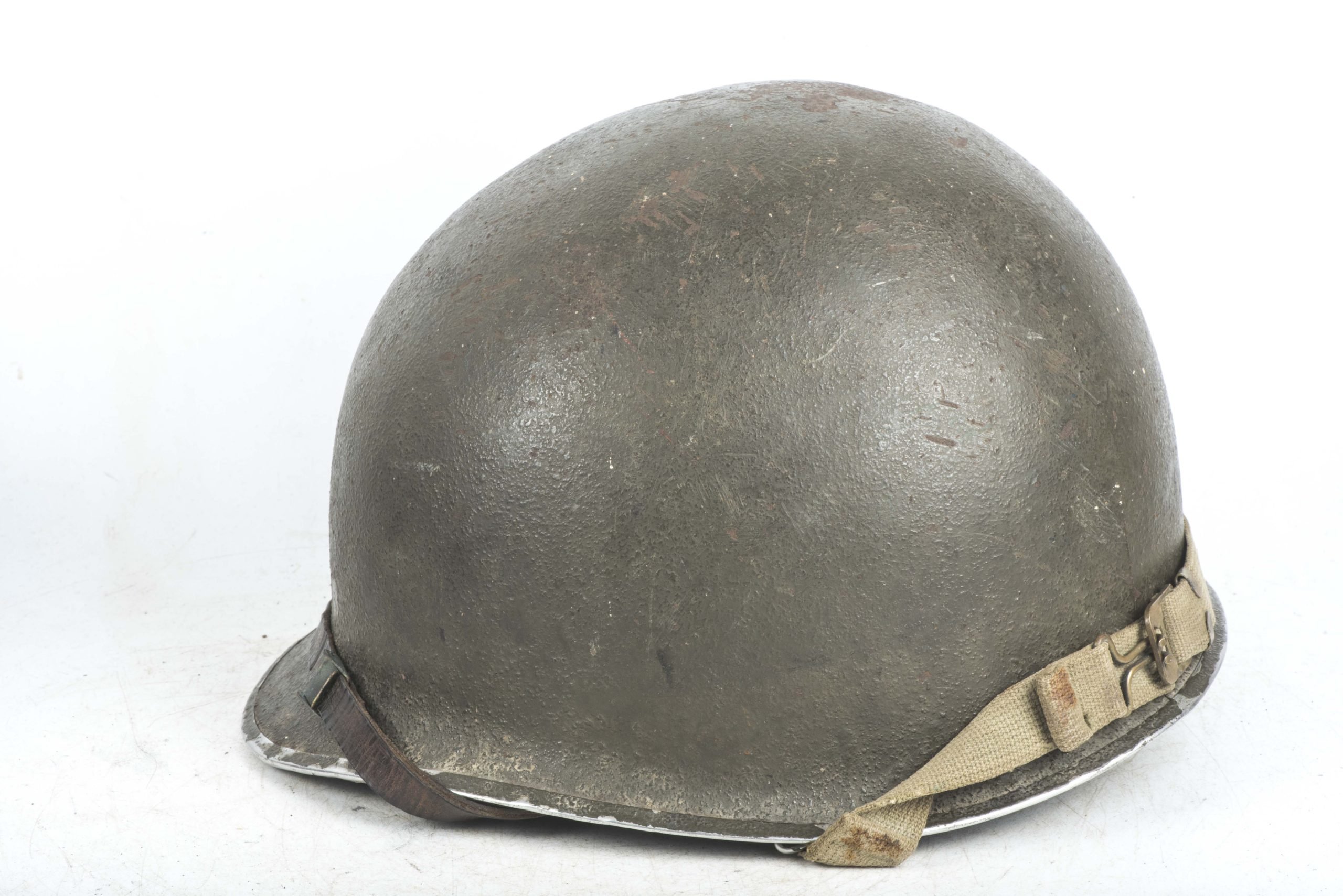 US M1 front seam fixed bale helmet ID'ed W0475 and 1713 in good used condition. The helmet and its liner both retain a laundry code indicating it was issued twice or mixed owners which seems to be common in the ETO. The liner is made by Westinghouse, the shell was made by McCord. A nice and textbook US world war two infantry helmet, in good used condition!