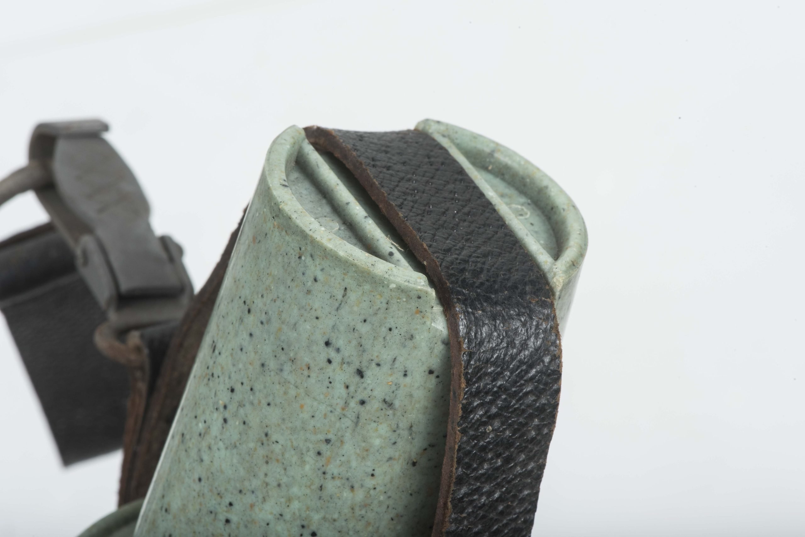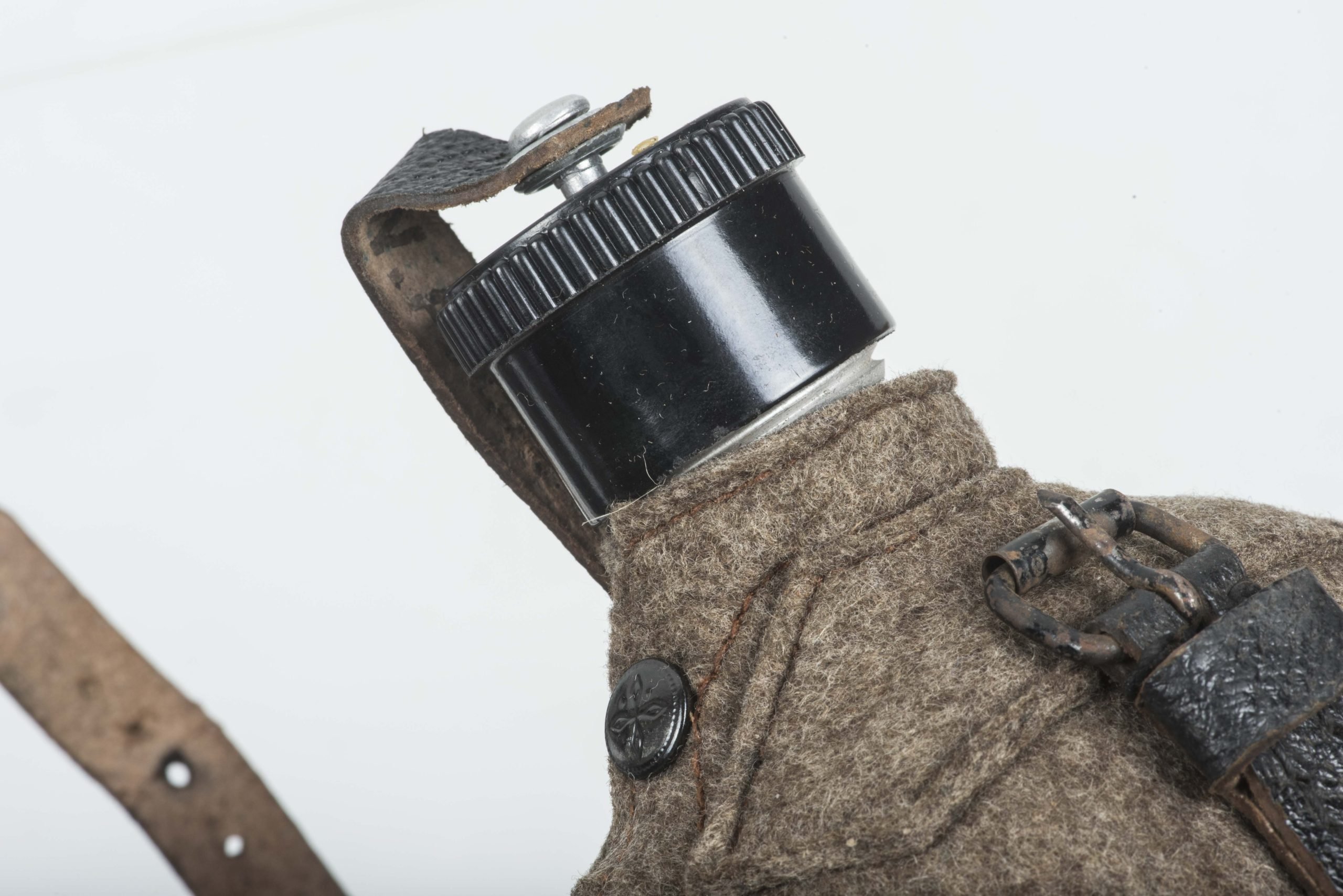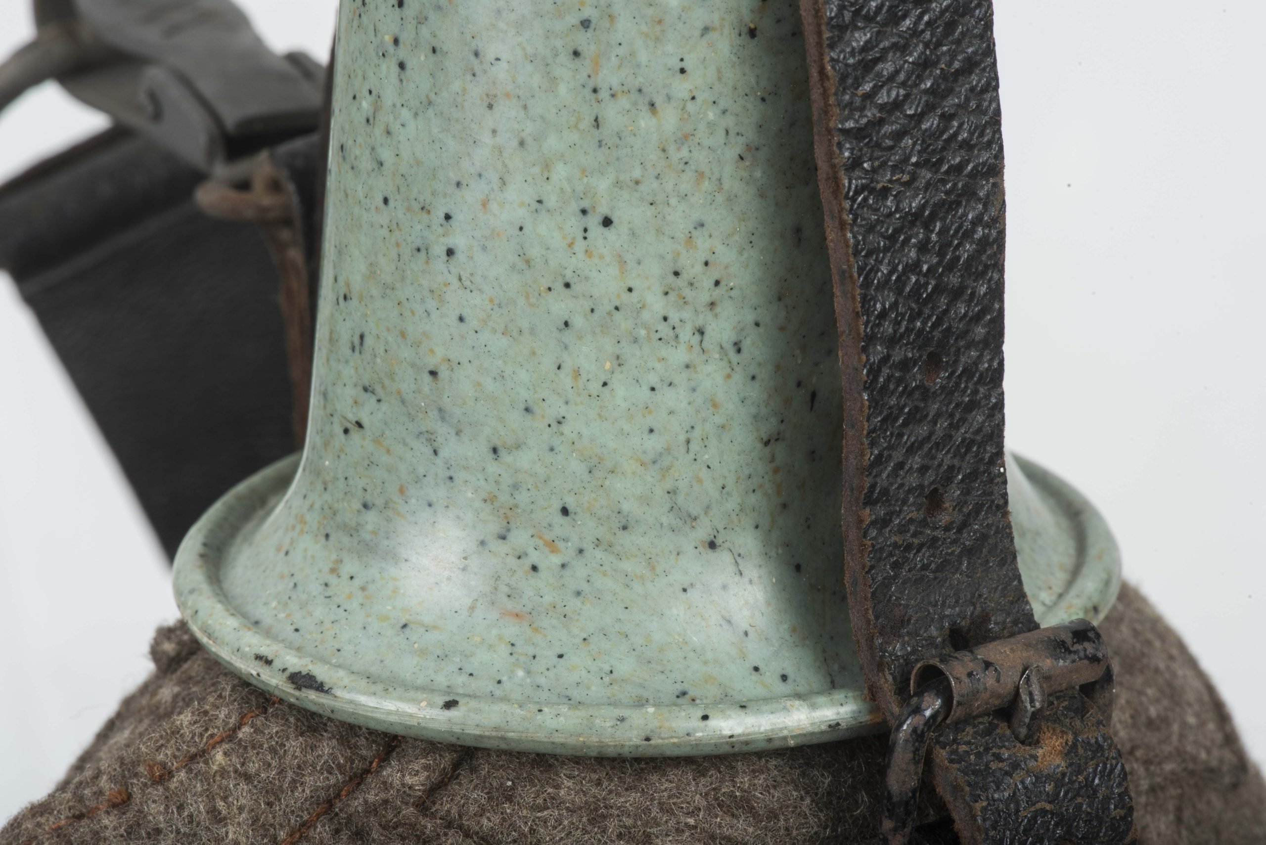 Textbook M31 1L capacity (medical) canteen or Labelflasche in excellent, unissued condition. The canteen itself is nicely marked W.A.L. 43 which indicates production byWestfalische Aluminium Industrie, Junger & Co., LΓΌdenscheid. The canteen is complete with its matching and factory issued belt loop. Sadly the end piece of the back strap is broken. The canteen comes in its original and textbook configuration with a bakelite canteen cup. The cup itself is a green base speckled cup which is extremely rare to find. Excellent canteen which is impossible to upgrade!