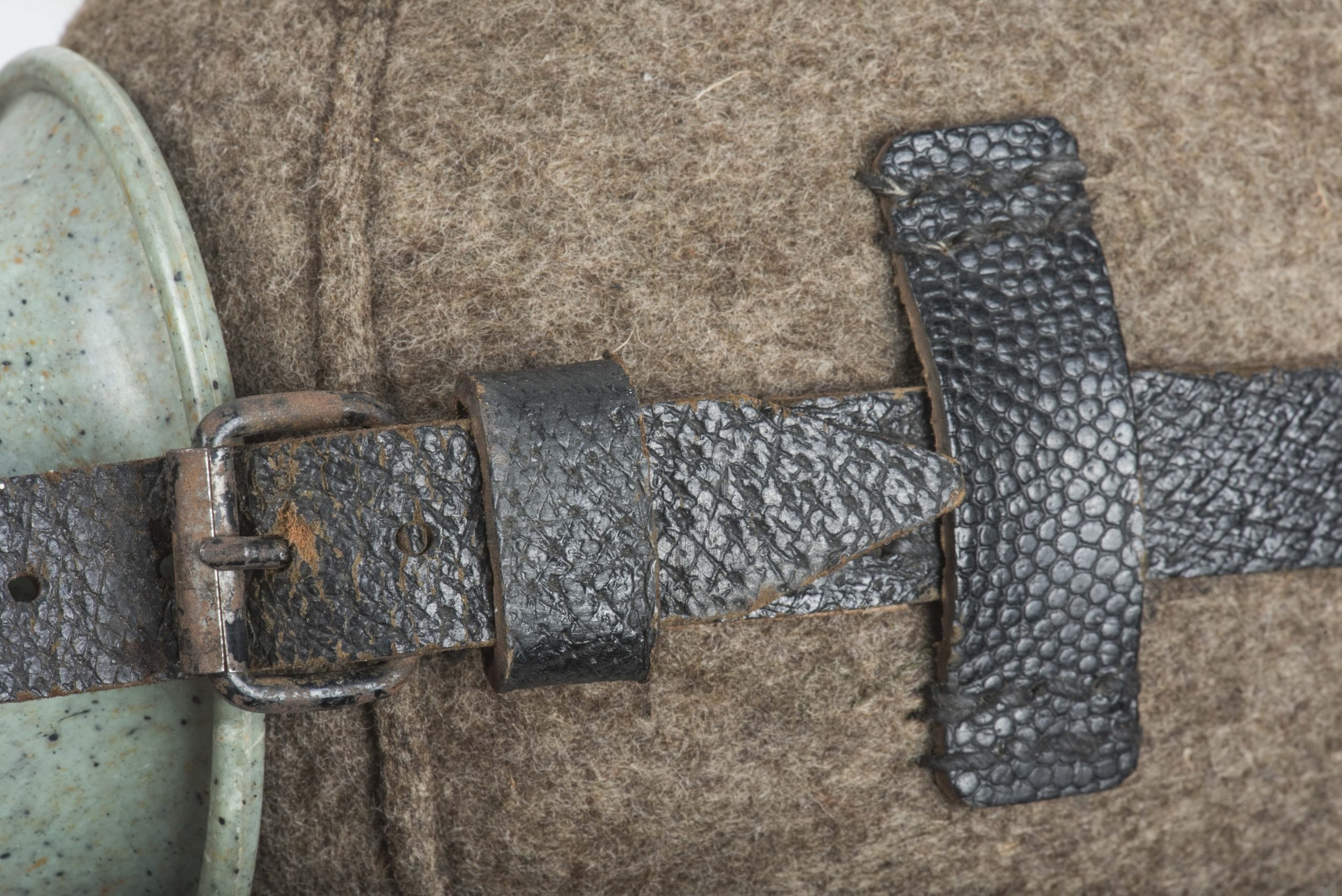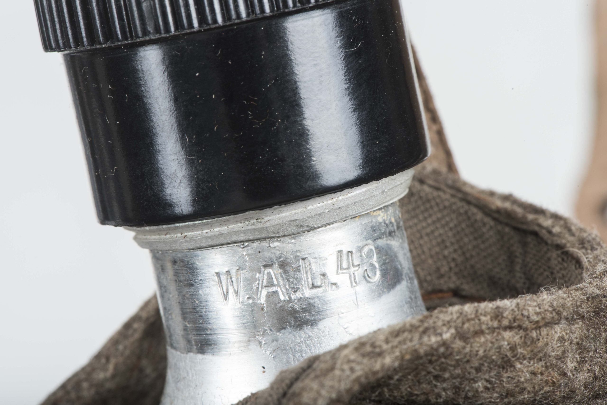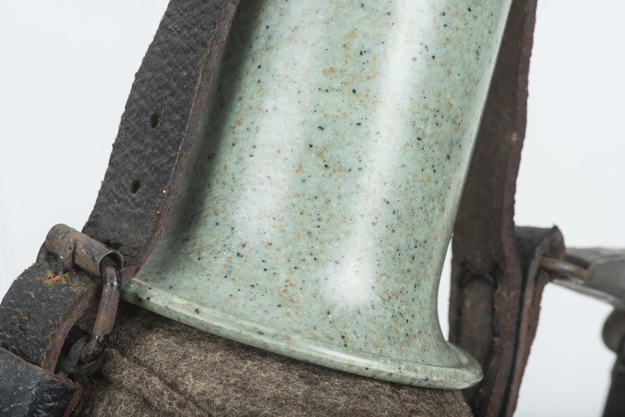 Textbook M31 1L capacity (medical) canteen or Labelflasche in excellent, unissued condition. The canteen itself is nicely marked W.A.L. 43 which indicates production byWestfalische Aluminium Industrie, Junger & Co., LΓΌdenscheid. The canteen is complete with its matching and factory issued belt loop. Sadly the end piece of the back strap is broken. The canteen comes in its original and textbook configuration with a bakelite canteen cup. The cup itself is a green base speckled cup which is extremely rare to find. Excellent canteen which is impossible to upgrade!