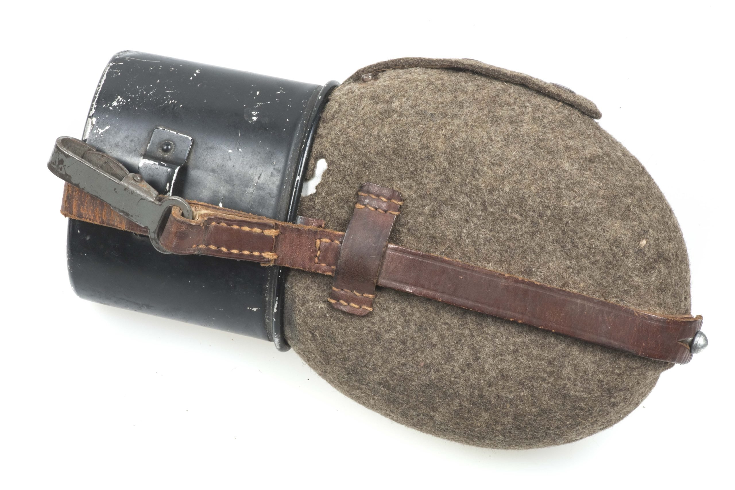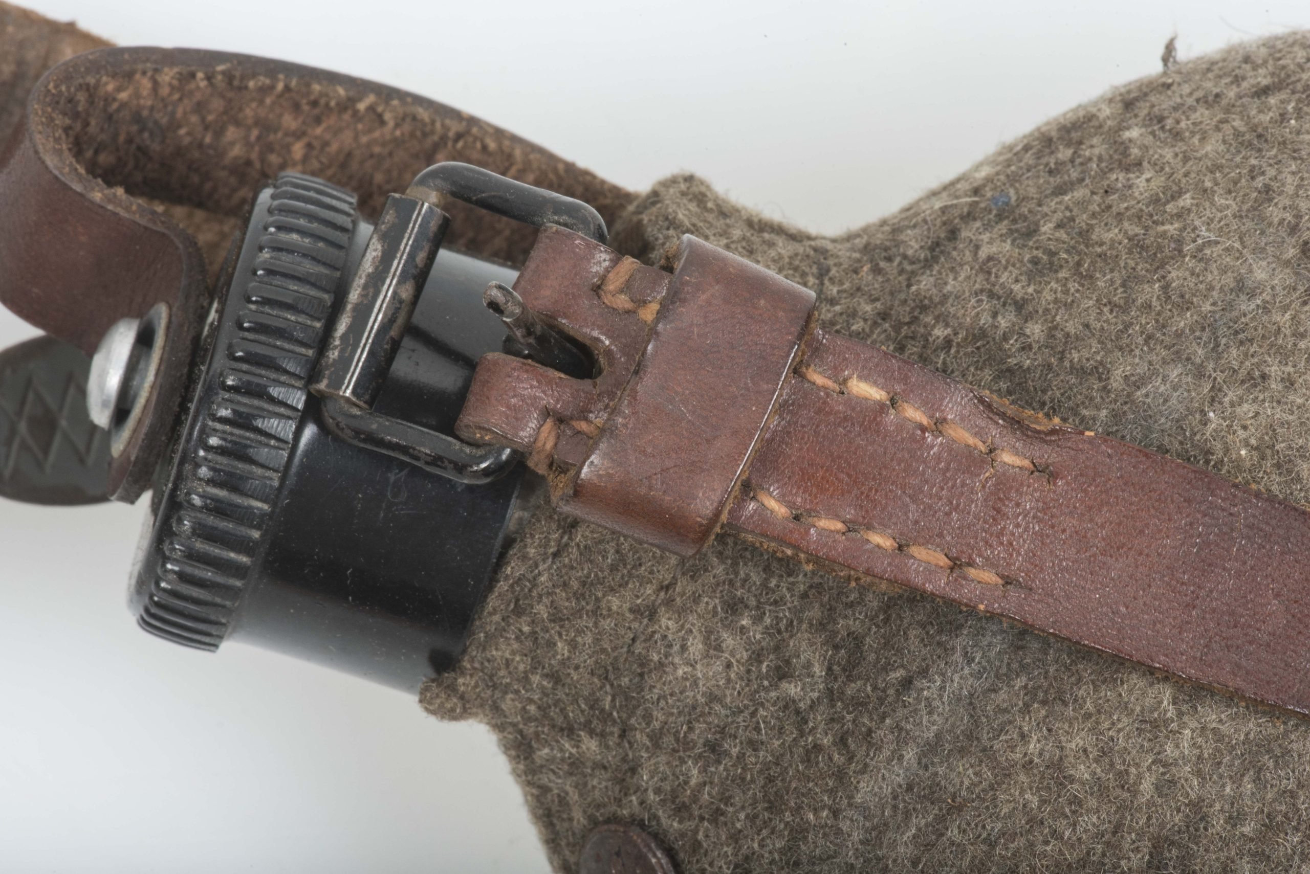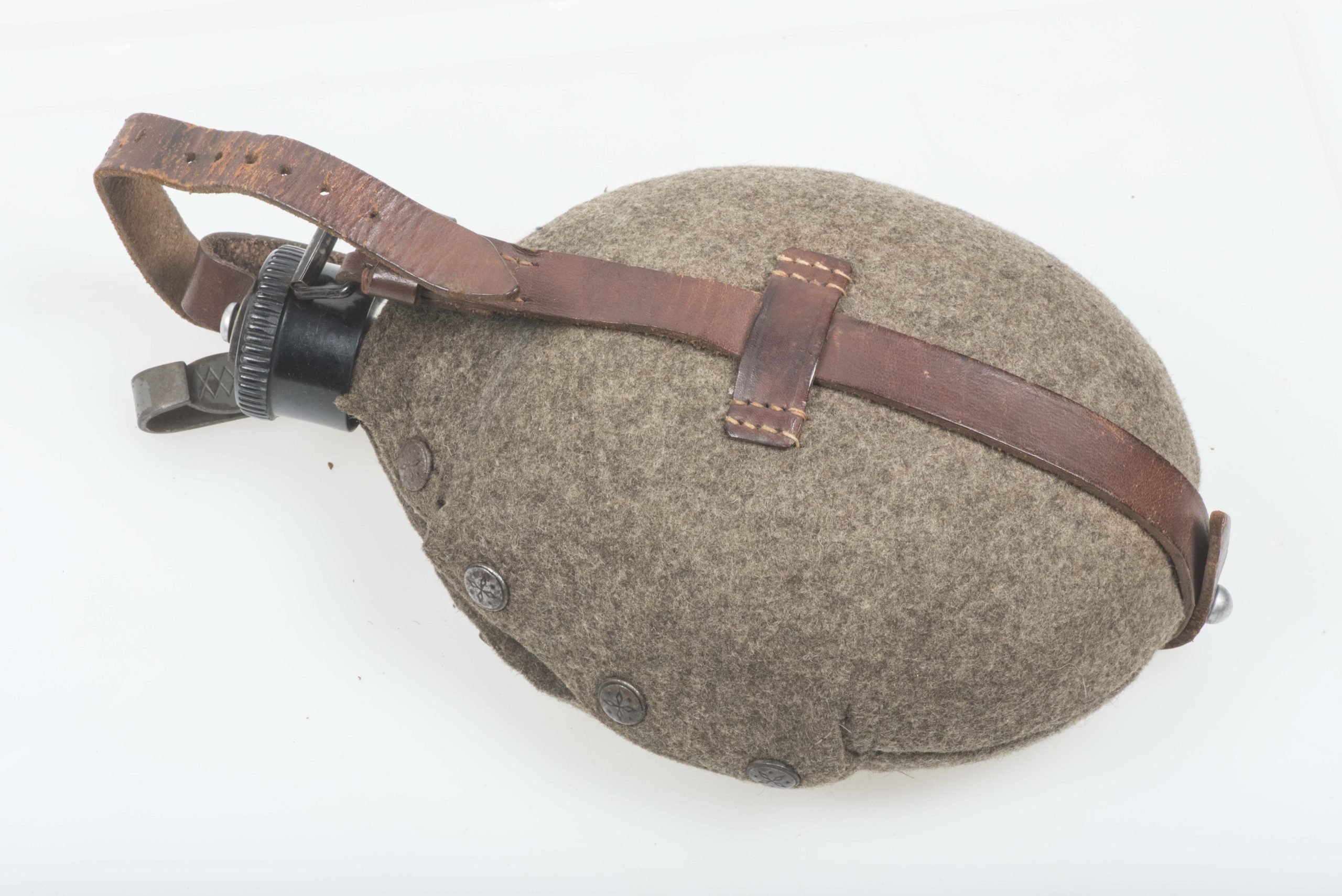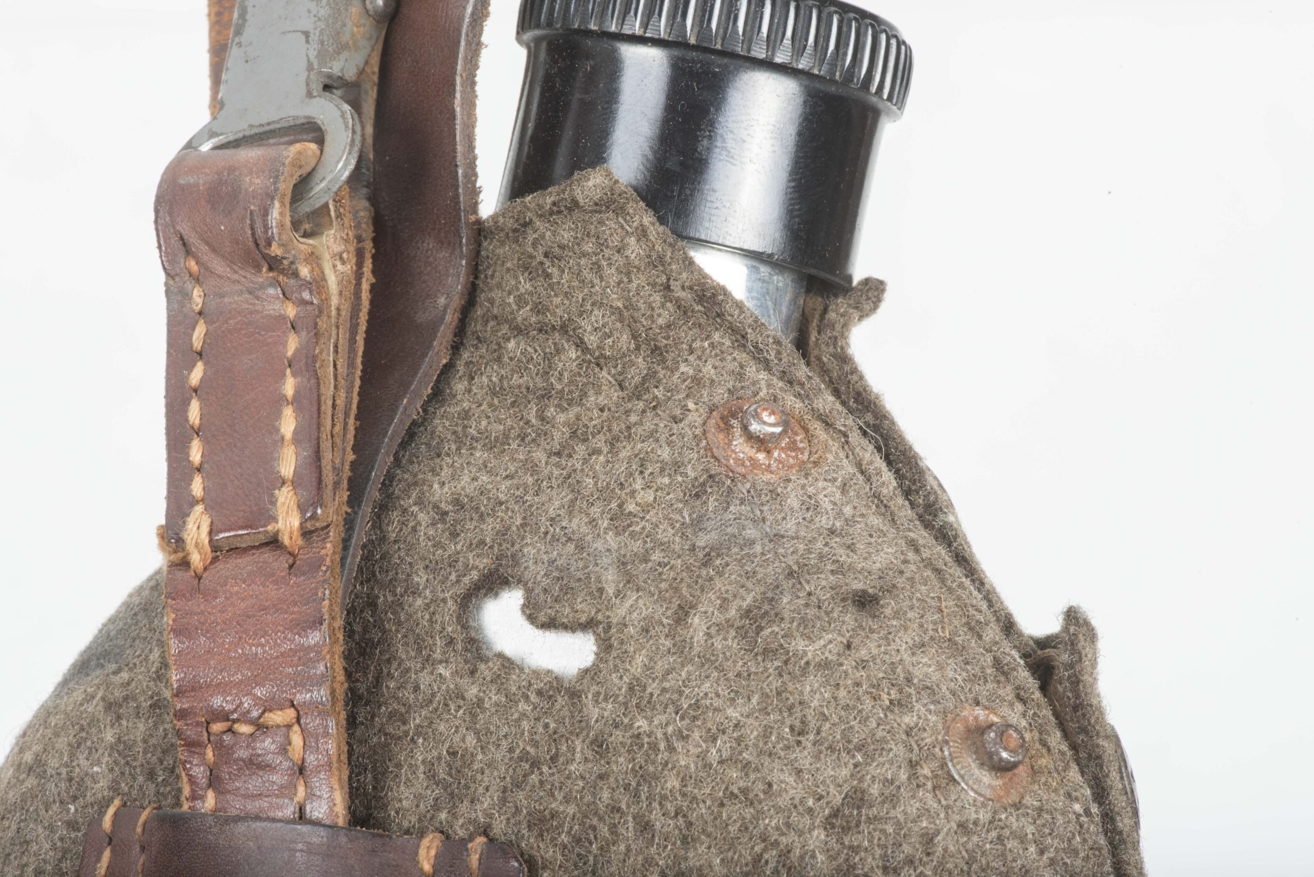 Textbook early war manufactured M31 canteen in very good condition. This canteen features light brown straps which is rather unusual for these early canteens. All parts are nicely marked L&SL 41 which indicates production byLinnepe & Schiffer Metallwarenfabrik, LΓΌdenscheid.Sadly the leather strap which is attached to the screw cap is broken. Very nice and textbook M31 canteen which would be hard to upgrade!