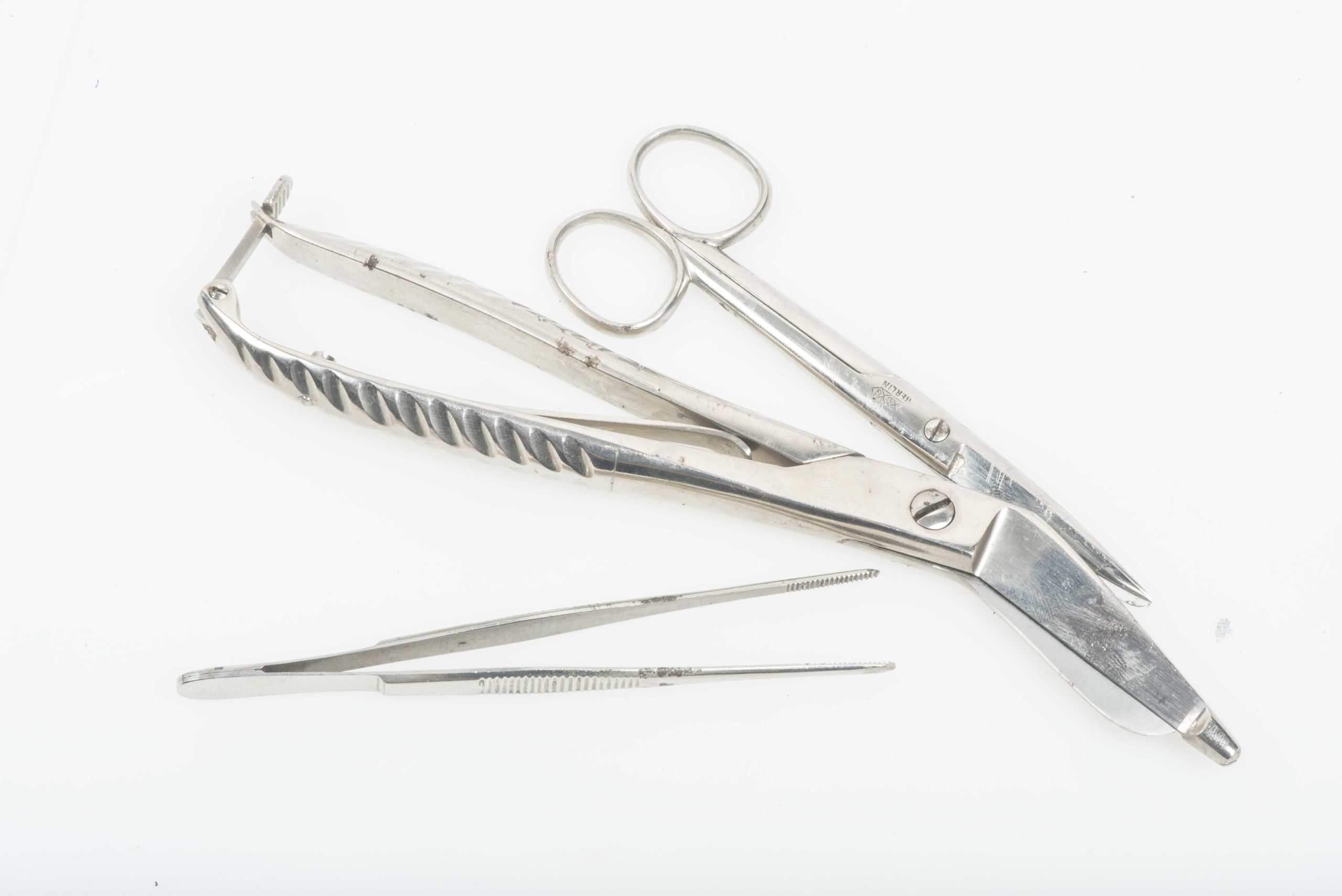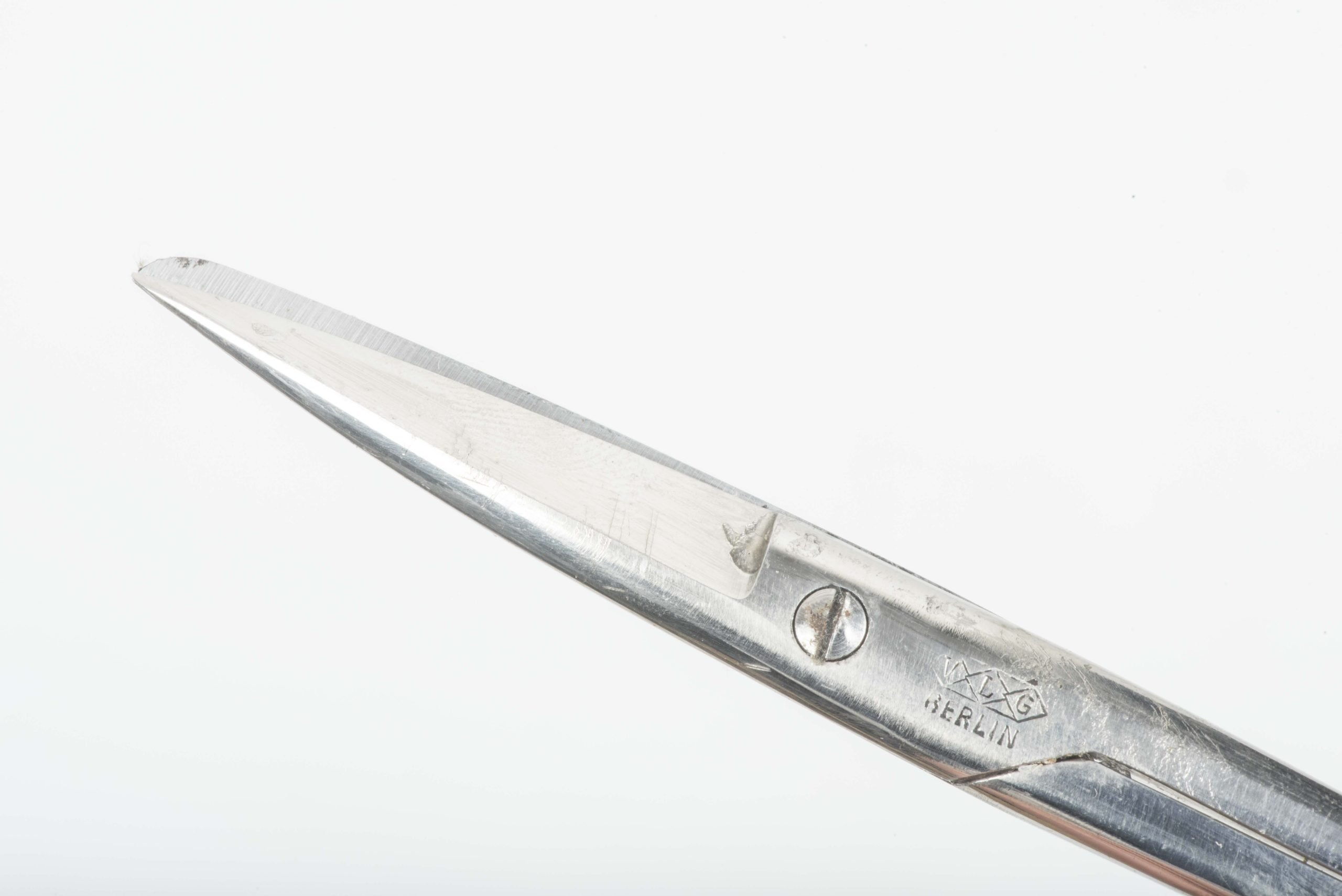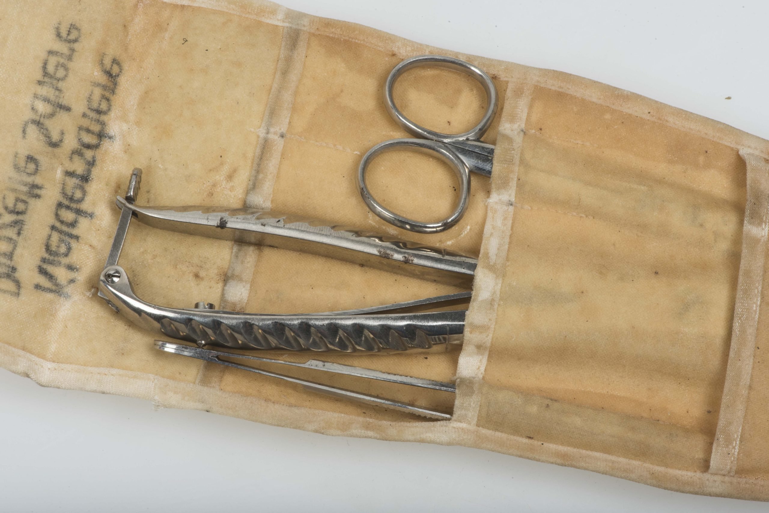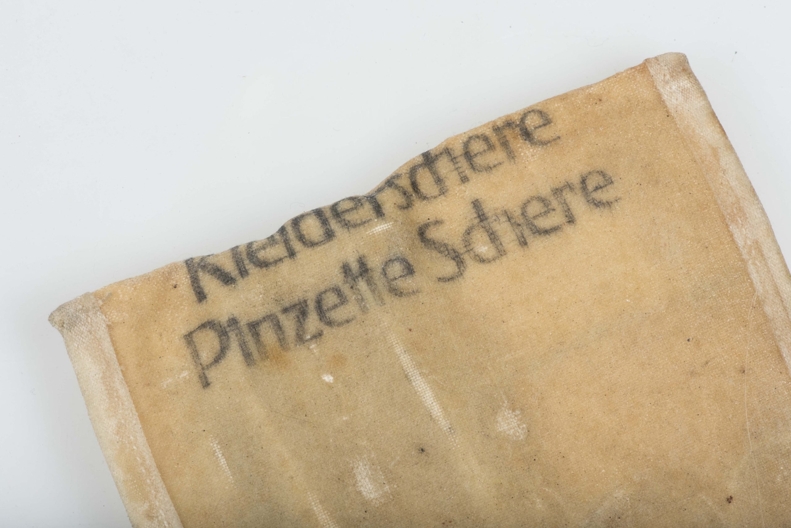 Rare clothing cutters or Kleiderschere in its original wax impregnated pouch. This is a rare variant which also contains a normal pair of scissors and a pair of tweezers. Typical piece that is a standard component of the Sanitätertaschen and Verbandkasten.