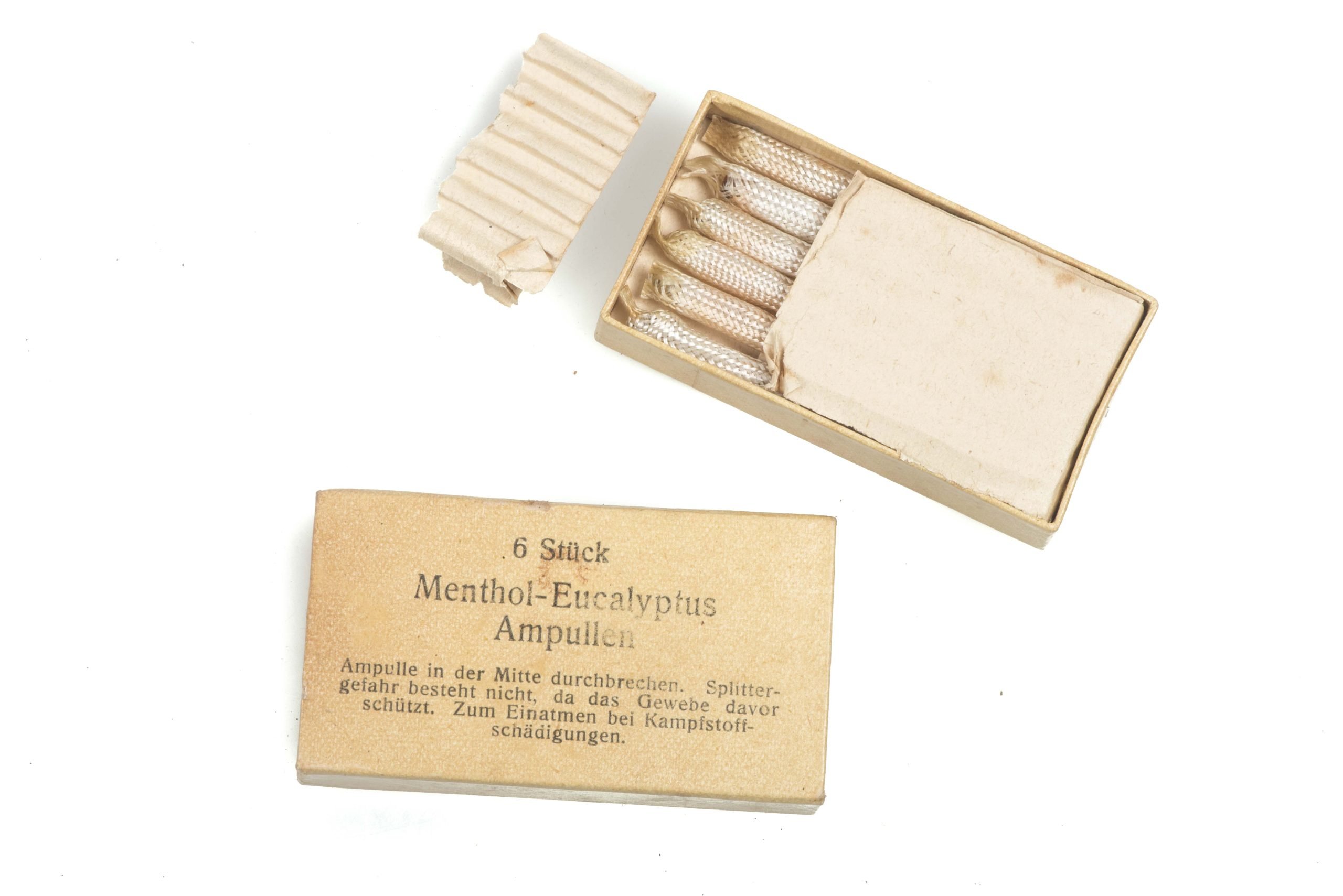 Rare cardboard box of 6 stΓΌck Menthol-Eucaluptus Ampullen or Riechmittel. These ampules should be broken and inherited in case of a chemical attack. This is a rare cardboard variant of the Tupfer fuhr Hautentgiftung & Riechmittel which is extremely hard to find!