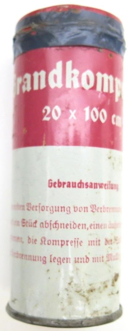 Very rare to find one of these dated. For fire wounds. Unopened and still sealed, (Obviously). These went into the Verbandkasten where you can read Brandbinde (Wismutbinde). These round pots were later introduced than the square ones in bare metal and named Brandbinde or Wismutbrandbinde. SO, you can use it for complete a Verbandkasten or a display or for collect them as themselves as I do.Shipping Costs:-Europe: 12,50 €.-Worldwide: 16,50 €.