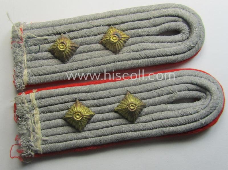 Fully matching pair of WH (Heeres) officers'-pattern shoulderboards as piped in the bright-red-toned branchcolour as was specifically intended for a: 'Hauptmann eines (Sturm)Artillerie-Rgts. o. Abtgs.'