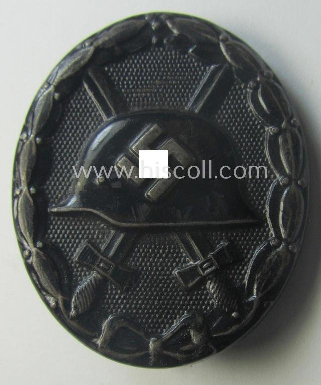 The very attractive - and actually scarcely found! - 'Verwundeten-Abzeichen in Schwarz' (ie. black-class WB) does show only minimal wear and age but truly retains most (ie. all!) of its original, black-coloured- and/or somewhat 'shiny'- (ie. glossy, satin-like) finish: it only shows minimal wear and was simply nicely preserved over the years. The wound-badge - that misses the paint on the swastika as more often - is as stated maker-marked with the makers'-designation: '113' (as is visible on the back of the badge as can be seen on the pictures) signifying that it deals with a piece that was produced by the desirable 'Hermann Aurich'-company based in the town of Dresden. Of course, are the (regular- ie. thin-shaped- and magnetic) pin and/or: (typical) catch (-set-up) fully functional and of course present. This piece has never been cleaned nor polished: it shows some minimal dust and/or minimal staining as to be expected. Simply an attractive - and actually scarcely found! - 'Verwundeten-Abzeichen in Schwarz' that will be impossible to be upgraded!
