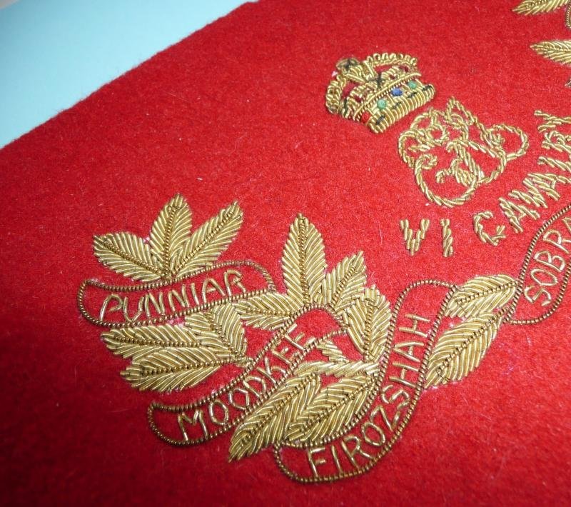 Most probably intended for use as the bullion ornament for embellishing a review order officer's dress pouch. Similar in design to that depicted in Ashok Nath's 'Sowars and Sepoys in the Great War 1914-1918 for the Governor General's Body Guard (Fig 2). Scarlet background is correct facings colour for this Regiment. Battle honours exclude WW1 honours. EDVII cypher to centre. A rare pre WW1 survivor with no moth, damage or fading. The panel is circa 20cms by 12cms. I cannot imagine what such a piece would cost today to make. Complete with original paper backing. Would make a great display item. Or if you have a tired pouch that needs restoring! Stunning.Amalgamated with the 7th Hariana Lancers in 1921 and became the 18th King Edward VII's Own Cavalry in 1936.Will only post to a UK address.Comm TeMo