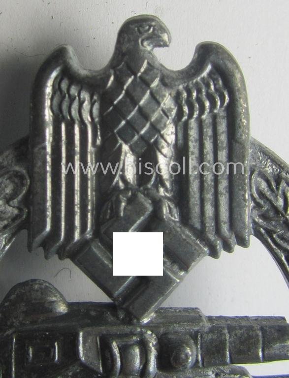 This is an attractive - and I deem just moderately used and/or worn but still very nicely preserved! - so-called: 'Panzerkampfabzeichen in Silber' (or: silver-class panzer assault-badge or PAB) being (I deem) a typical somewhat later-war-period- and non-maker-marked, zinc- (ie. 'Feinzink'-) based specimen that was procuced by the: 'Frank u. Reif'-company and that comes in an overall nice- (and I deem just moderately used- and/or worn), condition. The badge on offer here concerns an (I deem somewhat later-war-period-) zinc- (ie. 'Feinzink'-) based specimen that truly retains most of its (bright) silver-toned finish: moreover, does this piece show nice pronounced detail and/or finish as to be expected (as can be seen on the pictures). The badge is just a tiny bit stained- and/or tarnished as mentioned above. As stated above, is the piece a non-maker-marked example that shows the various characteristics - such as for example the typically-shaped pin-set-up and typical catch(set-up) - as only seen on PABs as produced by the: 'Frank & Reif'-company based in the town of Stuttgart: it deals with a so-called: 'non-maker-marked solid-zinc'-pattern award (as is uniquely numbered with the reference-number: '4.5.2.' according to the excellent reference-work entitled: 'The Panzer-Assault badge of WWII' by my Belgian friend Philippe de Bock). The neat piece - which is quite pronounced - naturally shows all the details as to be expected for a badge by this particular maker. It was found as such at a German private-household and was never before part of a collection. Simply a very nice and honest, silver-class 'variant'-PAB by the: 'Frank u. Reif'-company and that comes in an overall very nice and fully untouched, condition!
