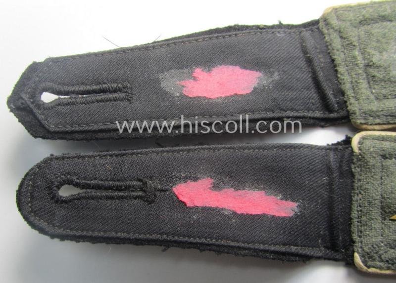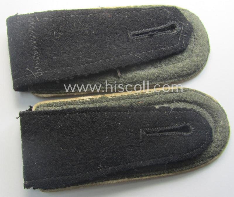 This is an attractive - very desirable, almost matching and nowadays very scarcely found! - pair of neatly 'cyphered', Waffen-SS, NCO-type shoulderstraps (ie. 'Schulterstücke für Unterführer der Waffen-SS') as piped in the white-coloured branchcolour as was specifically intended for usage by an: 'SS-Oberscharführer' (ie. sergeant) who served within the: 'Waffen-SS Infanterie-Truppen' ie. the: SS-Rgt. 'Deutschland' (2. SS-Pz-Div. 'Das Reich') and that comes in an overall nice- (albeit moderately ie. clearly used- and/or. worn-), condition. The shoulderstraps are constructed from the typical, (smooth-type) black-coloured-wool and show the black-coloured 'upperdecks': the straps are in all facets a typical 'standard-issued- and (I deem) mid- (ie. early-) war-pattern-type pair (I deem around 1940/1941). The shoulderstraps - which measure approximately 11 cms. sized in length each as more often encountered - show the neat white- (ie. 'weisser'-) coloured branchcolour and/or desirable 'silk-like'-type branchcolour ie. piping attached (as can be seen on the pictures). The straps - which are also 'backed' with field-grey-coloured wool as more often - come of course mounted onto their (typical!) early-pattern and regular-sized tongues, attached (something that is more often seen with genuine, early-period Waffen-SS shoulderstraps). The straps show the typical, silver-toned NCO-braid and a pair of (matching, aluminium-based and/or regular-sized) pips period-attached. Moreover, do they show a pair of (Gothic-styled, non-magnetic ie. I deem 'Buntmetall' and/or tarnished, silverish-toned) so-called: 'D'-cyphers (ie. 'Ziffern') period-attached. One of the cyphers came apparently loose overtime and was re-attached by means of some stitching (as can be noticed on the pictures). The straps were clearly (ie. quite heavingly!) used but are void of any real damage but do show some obvious wear, age and/or staining (as can be seen on the pictures). Moreover, were they once glued into an album or scrapbook and do show some paper- ie. glue-remains on their backs. It should be noted that almost every collector is looking for these white-piped, 'cyphered' Waffen-SS NCO-type-shoulderstraps but these are very hard to find and that come nowadays hardly ever for sale. The straps are as stated above clearly used ie. worn (one of the straps shows a tiny moth-hole). It should be noted that these original, period 'cyphered', Waffen-SS NCO-type-shoulderstraps can easily be graded 'rare': even more so, when they are piped in the rarely encountered, white-coloured- (ie. 'SS-Infanterie-Truppen'-related-) branchcolour!