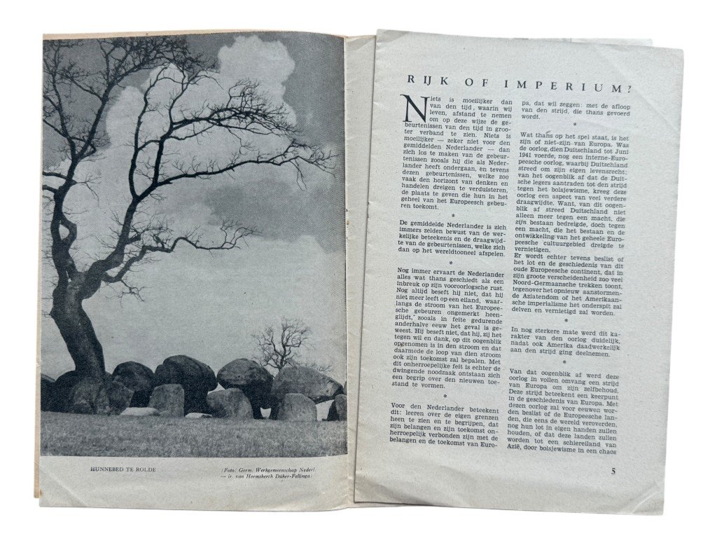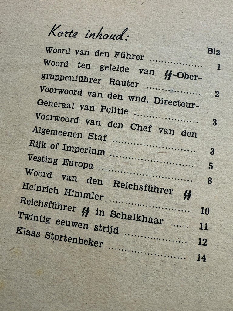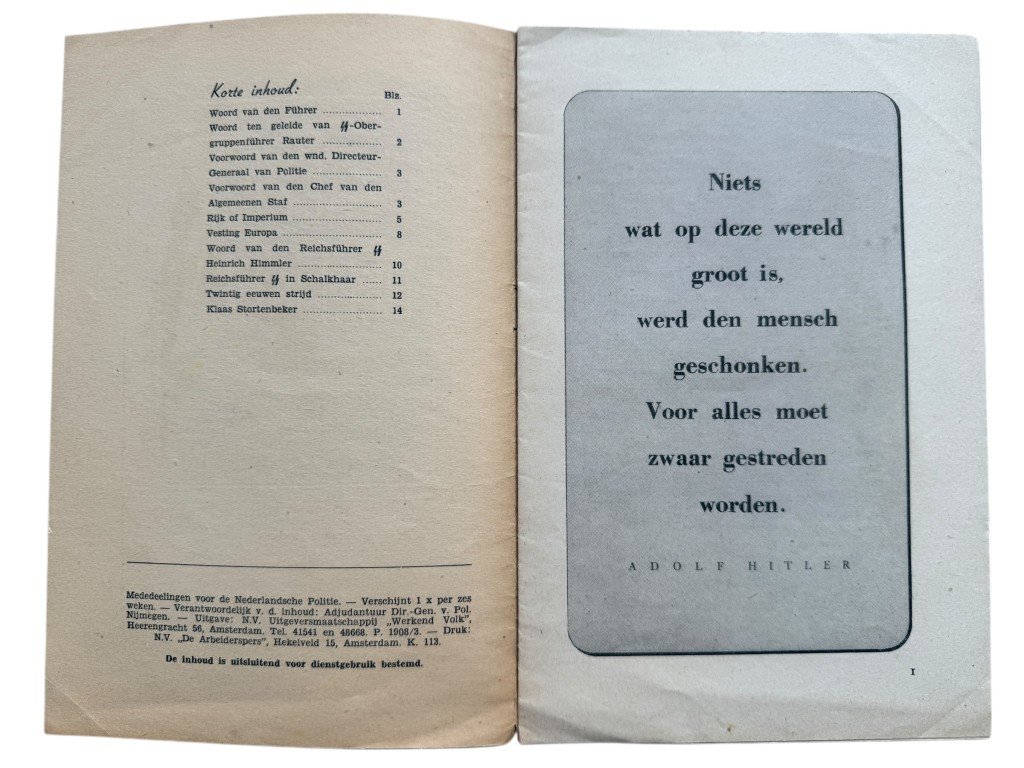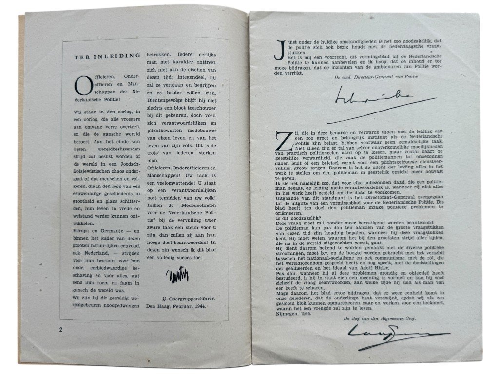 This edition of Mededeelingen voor de Nederlandsche Politie was published in 1944 under the supervision of the Directorate-General of Police.This propagandistic police magazine was distributed among members of the Schalkhaar and State Police and contains texts and speeches by, among others, Adolf Hitler, Heinrich Himmler, and Hanns Albin Rauter.The publication provides a striking insight into the ideological influence and collaboration of the Dutch police during the German occupation.The booklet is in good original condition with all pages complete, only the staple is missing.An interesting item for any Dutch Police or collaboration collection!Article number: 16851