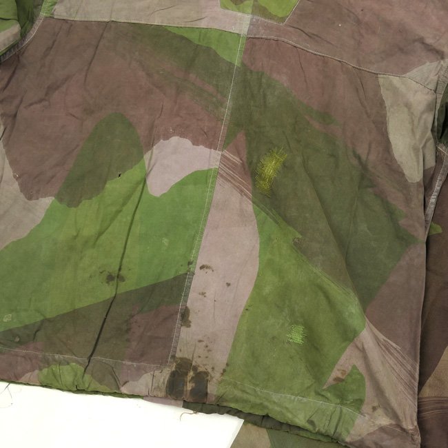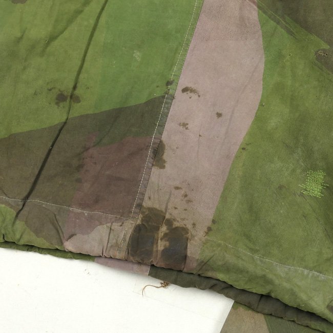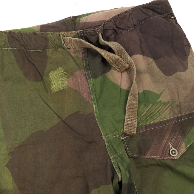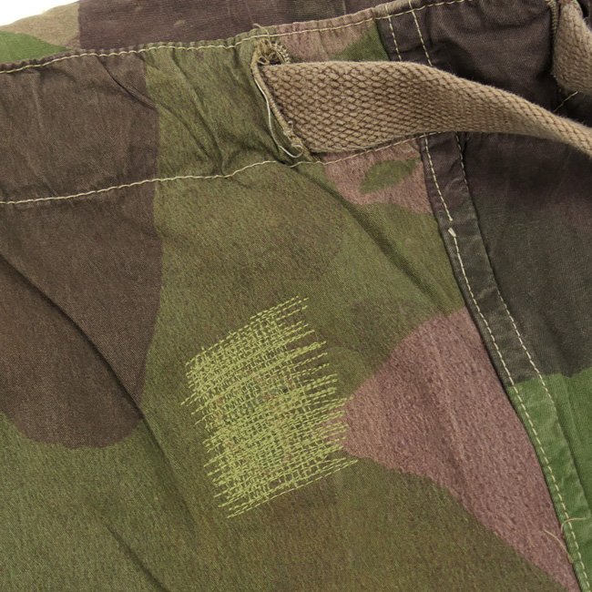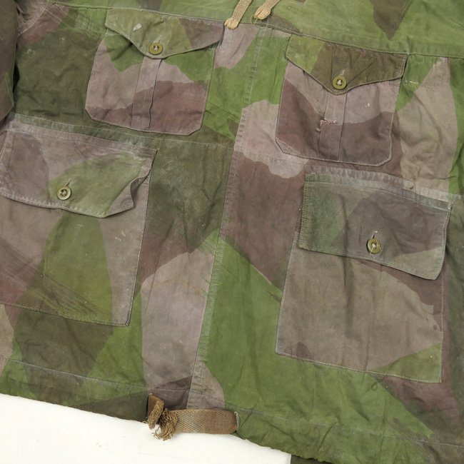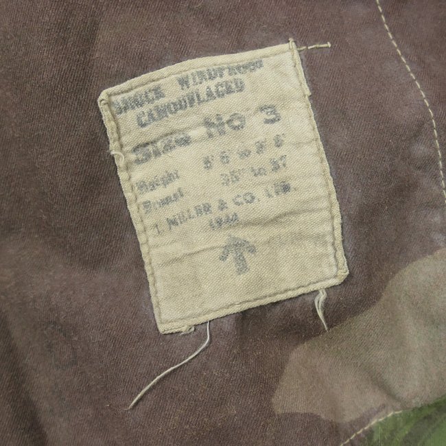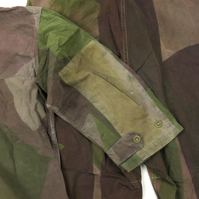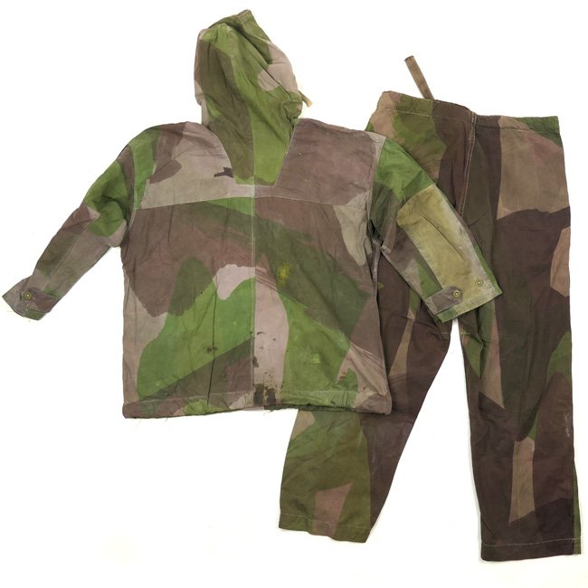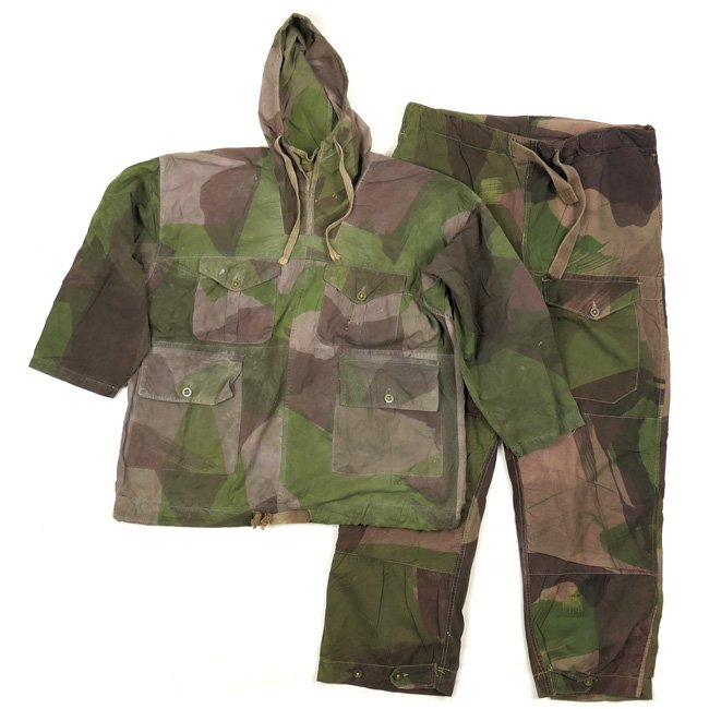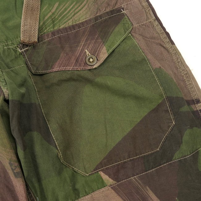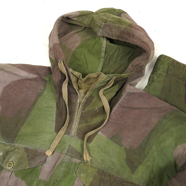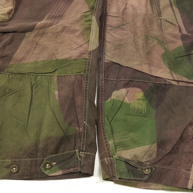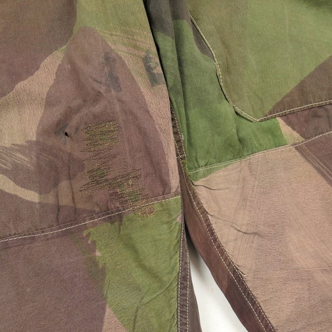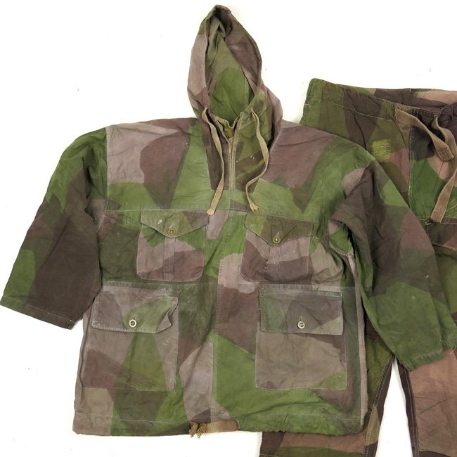 British Army Windproof Camouflage Smock & Trousers. These windproof trousers were introduced in 1943 along with the matching smock in the same material. This is a nice set of both the lightweight cotton smock and trousers, printed with an overall brown-beige-green camouflage pattern, similar printed design as the Denison Smock. These were intended to be worn over the battle dress with any equipment to be worn over the smock & trousers. smock and, the smock is size 3 marked. I couldn't find any label or markings inside the trousers. Both the smock and trousers are showing clear traces of usage, staining and some repairs, see photos. Rare original windproof smock & trousers in good combat worn condition!
