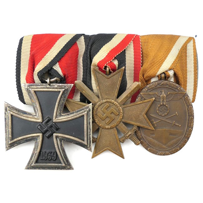This is a nice 4-piece tailor-made Medal Bar (Ordenspange), showing respectively an Iron Cross 2nd Class (Eisernes Kreuz 2. Klasse), a War Merit Cross 2nd Class with Swords (Kriegsverdienst Kreuz 2. Klasse mit Schwerter) and a Westwall Medal (Deutsches Schutzwall-Ehrenzeichen). The medals are nicely period mounted on a medal-bar for wear on the 'walking-out' tunic. The medal bar is mounted on a metal-plate with a fieldgrey woolen backing and comes with its functional pin/catch set-up. The medal-bar is complete with tailor tag by 'Ed. Scherm' from NΓΌrnberg. Nice original medal-bar in very good condition!