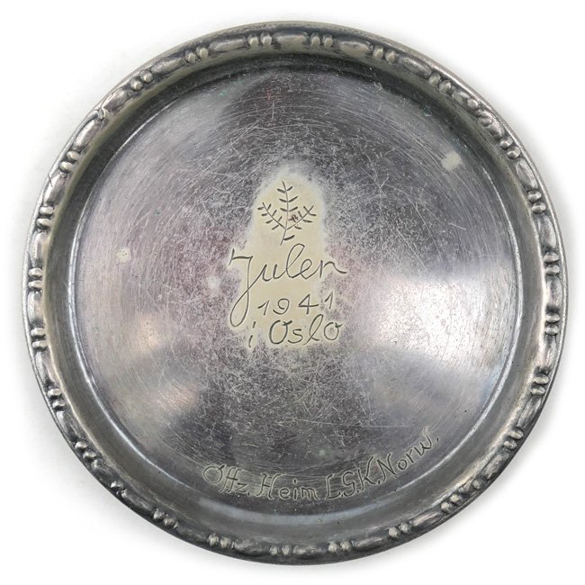 Silvered Coaster engraved with 'Julen 1941 Oslo' and 'Offz.Heim L.G.K.Norw.', indicating that this coaster was a Christmas Gift to Officer's of the 'Luftgaukommando Norwegen' for Christmas 1941 in Norway. The coaster is having a diameter of approximately 9cms. Nice and unique original item!