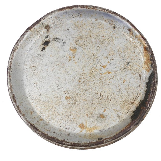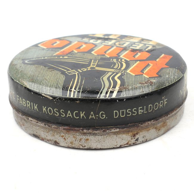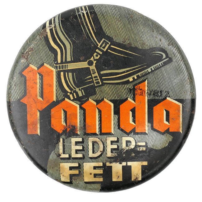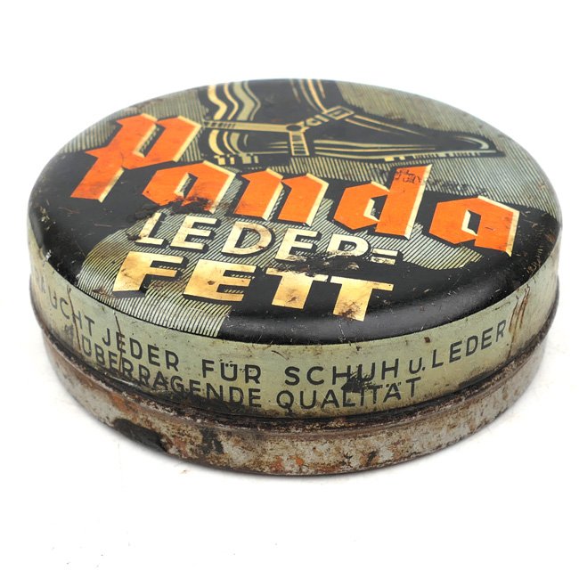 German Black 'Panda' Leather Grease Tin (Lederfett). The Panda leather grease was produced by the 'Chemische Fabrik Kossack A.-G.' from DΓΌsseldorfThe tin is sized approximately 9,5 cms in diameter. The empty tin is in overall good used condition and very decorative. Nice original personal kit item!