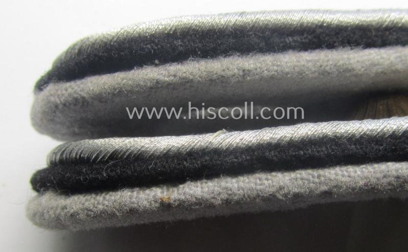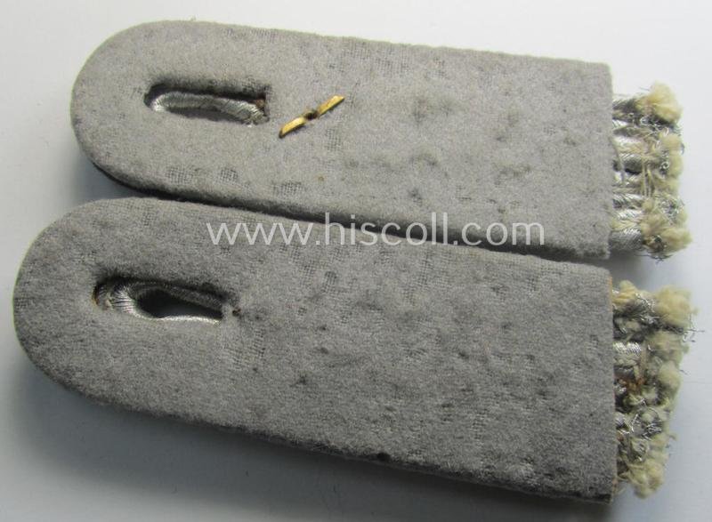 The attractive - neatly 'cyphered'! - WH (Heeres) officers'-type pair is neatly (dual)piped in the black- (ie. 'schwarzer'-) coloured branchcolour and has the typical dove-grey-coloured 'underlay' (ie. secondary branchcolour) and was as such intended for a: 'Hauptmann der Reserve des Pionier-Batallions 26' (or: reserve-captain who served within the 'Pionier'- (ie. engineers) 'Bataillion' (ie. battalion), numbered: '26') and comes in an overall nice- (I deem just moderately used- and/or carefully tunic-removed-), condition. The shoulderboards are 'text-book'-examples of the 'Heeres'-type, 'Pioniere'-shoulderboards and have the silverish-grey-coloured (ie. somewhat shiny-toned) 'upperdecks' (as can be noticed on the pictures). The boards show the desirable black- (ie. 'schwarzer'-) coloured branchcolour (and have the typical dove-grey-coloured 'underlay' ie. 'Zwischenfarbe'): they were constructed from the typical 'smooth'-type wool as to be expected. The boards never had any tongues attached and were intended for - and used! - as a pair of the 'sew-in'-pattern (as can be seen on the pictures). The boards measure approximately 11 cms. in length each and were most certainly issued- and/or worn as such and do show moderate age, wear and/or staining as to be expected. The pair - that was recently found at a German private-household - shows a fully matching set of (neatly bright-golden-toned, larger-sized and/or identical) '2'- and/or: '6'-numerals (ie. 'Ziffern') and two pairs of (larger-sized, equally-styled) pips period-attached. All 6 devices are just minimally stained- ie. tarnished but have preserved a fine and fairly bright- (and/or quite shiny!) age-patina. Simply an attractive WH (Heeres) officers-pattern shoulderboard-pair that belonged to a: 'Hauptmann der Reserve des Pionier-Batallions 26'!