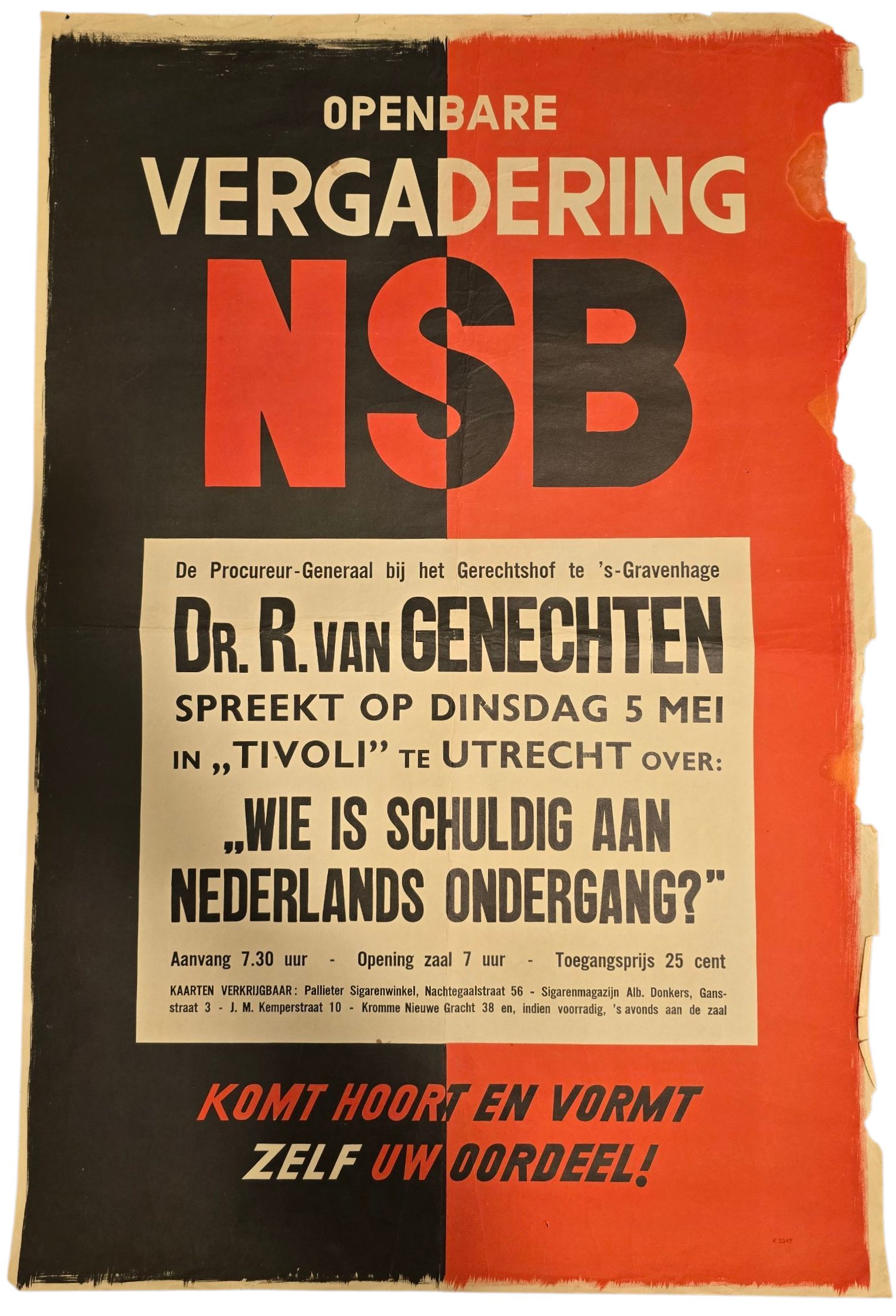 Original WW2 Dutch Collaboration NSB Poster - Public Gathering NSB Tivoli, Utrecht, R. van Genechten (1942)Approximately 85 x 57 cmDamage on the right side of the poster.Originele Wo2 Nederlandse Collaboratie NSB Poster - Openbare vergadering NSB R. van Genechten, Tivoli, Utrecht (1942)Ongeveer 85 x 57 cmSchade rechts van de poster.