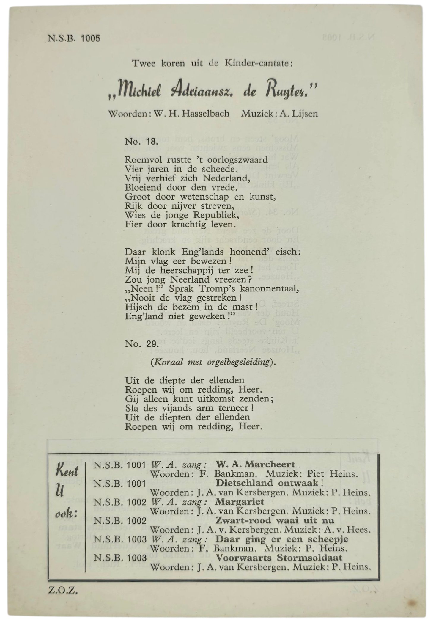 Original WW2 Dutch NSB Collaboration Document - Kinder-cantate Michiel de Ruyter song text (1944)