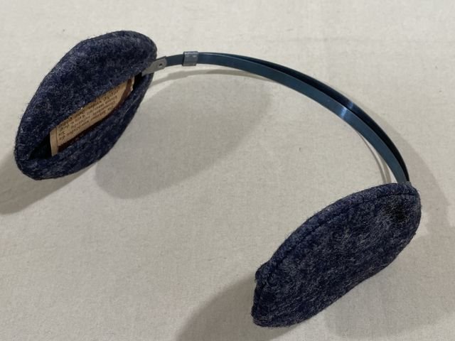 UNUSED thin wool ear muffs in Blue Wool on an adjustable metal frame. With DRP marked paper tag.