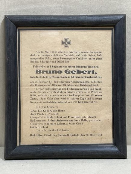 Original WWII German Framed Remembrance Card to Fallen NCO