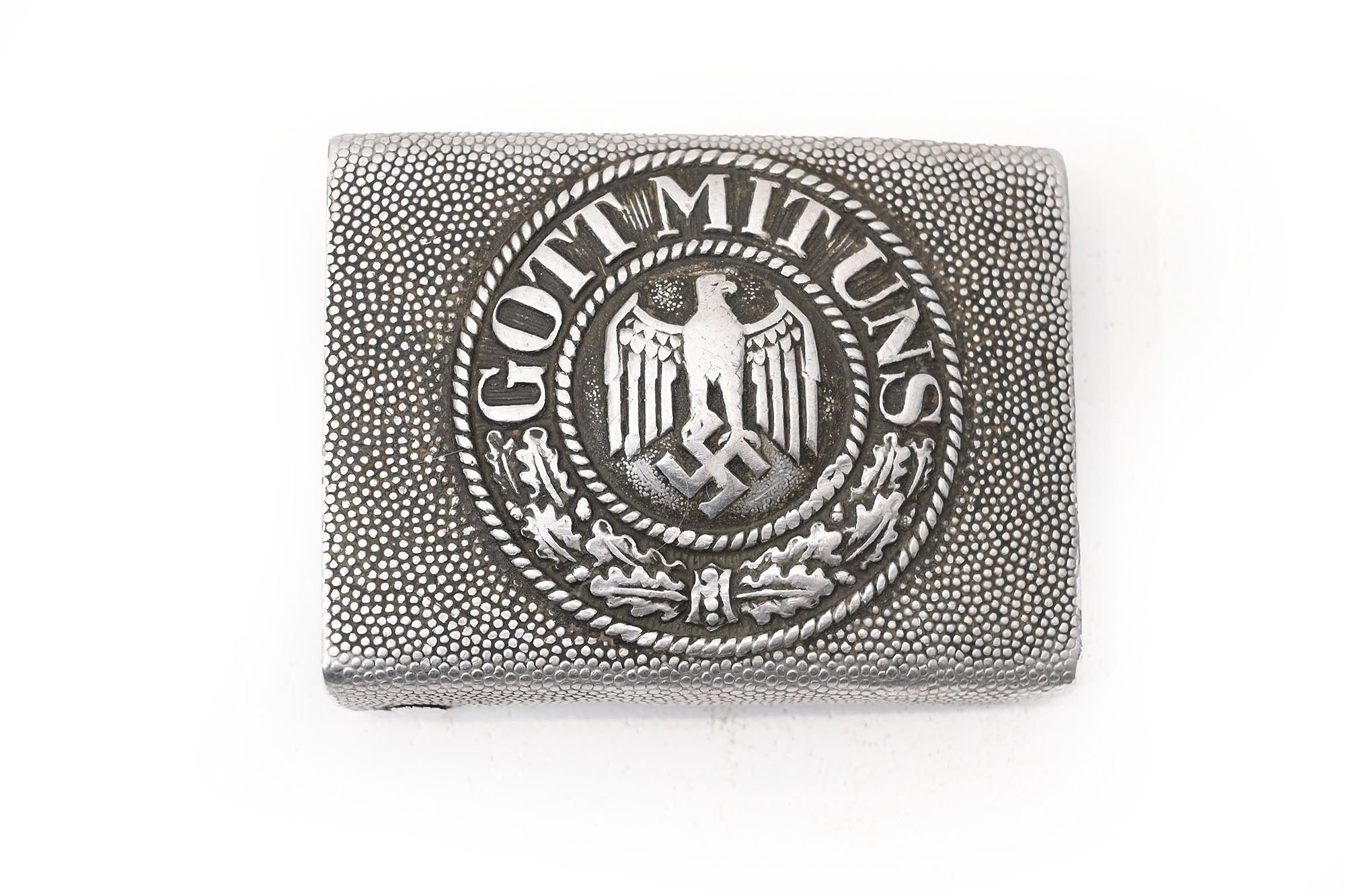 Wehrmacht (Heer) Belt Buckle (Koppelschloß). On January 24, 1936, this new model enlisted belt buckle was officially introduced, replacing the previous Weimar-period Reichsheer belt buckle. The basic design remained unchanged, with only the addition of the new Wehrmacht-style national eagle. This belt buckle model was worn throughout the Third Reich, with minor variations and color differences. The color differences were determined by regulations, which dictated which uniform style it was worn with. A beautiful field gray-painted aluminum belt buckle. The belt buckle is maker-marked 'B&N 37,' indicating production by Berg & Nolte AG from Lüdenscheid in 1937. A beautiful, original, early belt buckle in good used condition!
