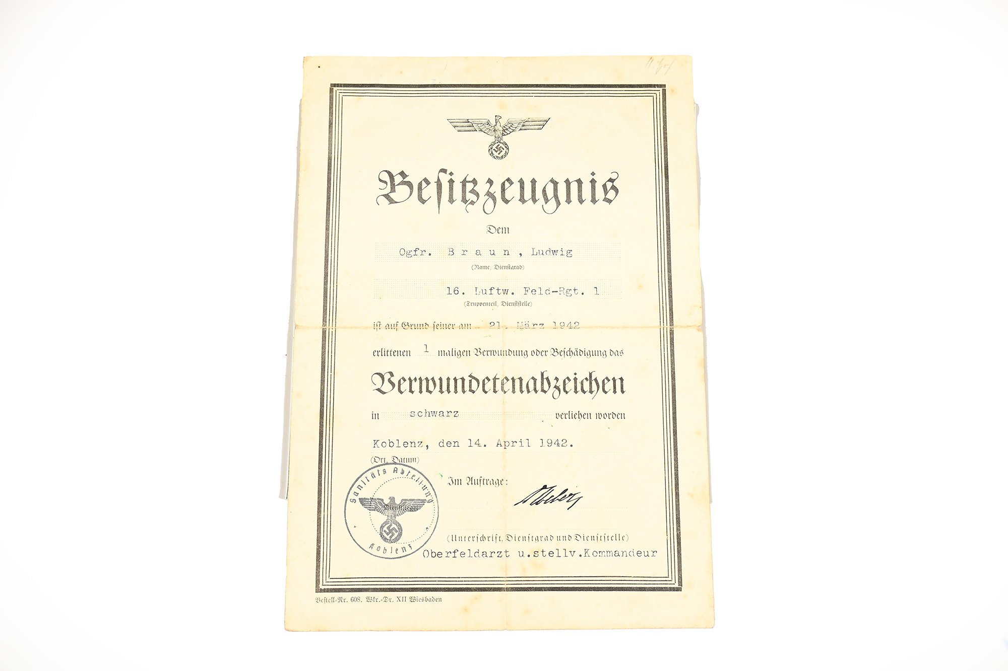 The Verwundetenabzeichen (Wounded Medal) was first instituted in 1918 during World War I and reinstated by Hitler in 1939. It was one of the most common awards in the Third Reich, yet held significant personal significance for the recipient: it was visible proof that one had truly suffered at the front.Recipient name:Ogfr. (Obergefreiter) Ludwig Braun.Unit:16. Luftwaffen-Feld-Regiment 1 (a field regiment of the Luftwaffe that was deployed as ground troops).Award:Verwundetenabzeichen in Schwarz(the Verwundetenabzeichen in black).This was the Wound Badge in black, awarded for being wounded once or twice by enemy action.There were also silver (3–4 injuries) and gold variants (5 or more, or very serious injuries).Date of injury:March 21, 1942.Place of award:Koblenz, 14 April 1942.Signed by:asenior physicianand deputy commander.Stamp:'Sanitätsbereich Koblenz' with the Reichsadler
