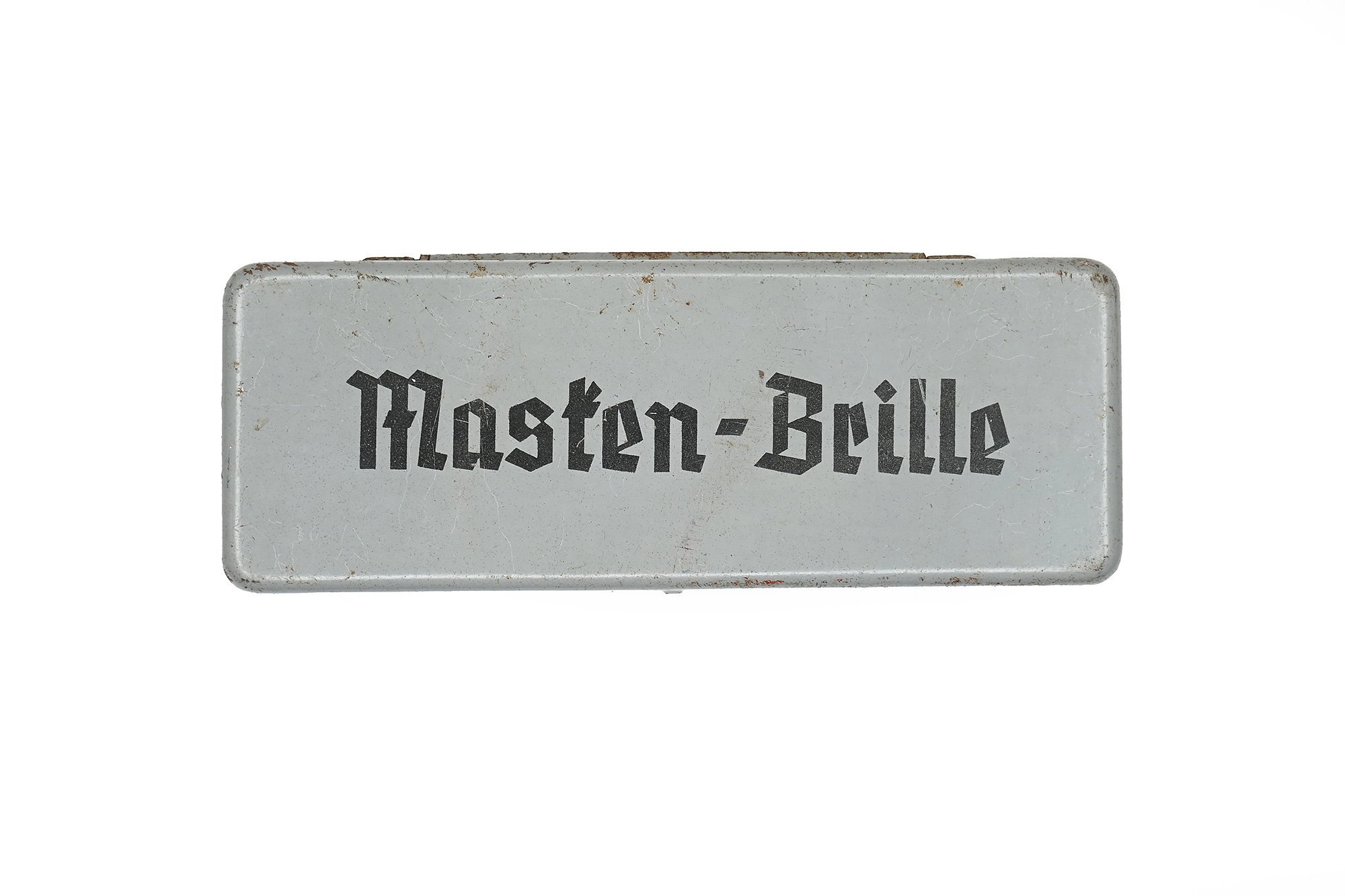 This is a very nice blue-gray metal box for a standard Wehrmacht mask-glass, complete with its original metal goggles. These glasses have never been used and therefore have no lenses. A nice accessory to complete a mannequin or to complement German armor. A beautiful set in good condition.