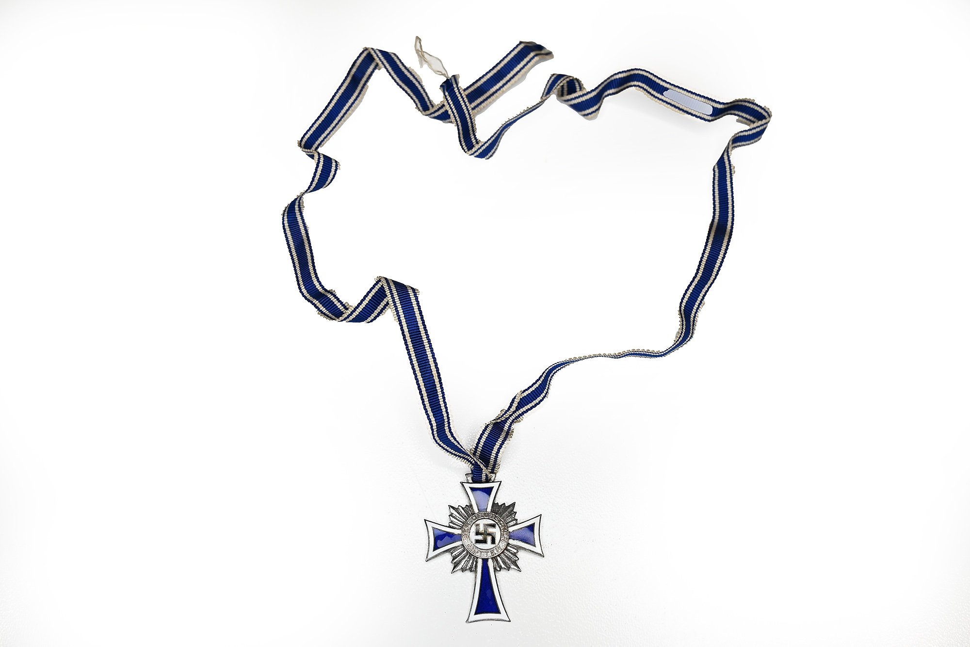Silver Cross of the German Mother (Ehrenkreuz der Deutschen Mutter). This medal was instituted by Adolf Hitler on December 16, 1938, to encourage childbirth. The medal was introduced in three classes: the Bronze Cross for the fourth child, the Silver Cross for the sixth child, and the Gold Cross for eight or more children. Children were important for the future of the Reich. The cross is complete with its original long ribbon. A beautiful original cross in good condition!