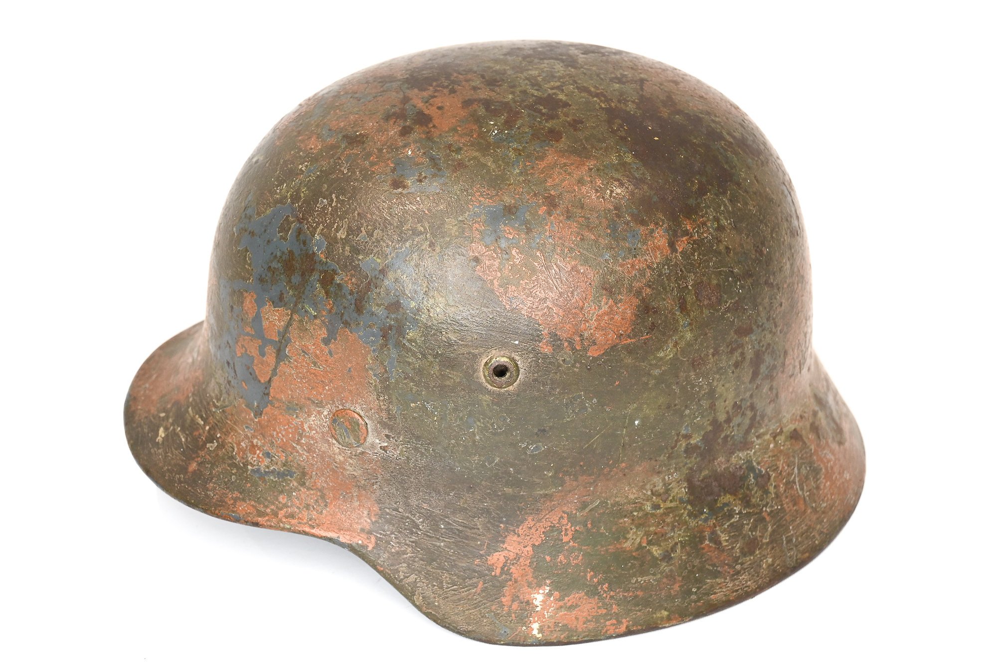 Beautifully worn M35 Luftwaffe camo helmet with a green-brown camo layer, the early blue Luftwaffe color underneath, and both decals still under the camo paint.The helmet was also fitted with a camo net, but unfortunately this was removed at some point.The helmet itself is made by EF Emaillierwerk AG, Fulda and is size 64.lot number is 3873A dome stamping is still vaguely visible in the helmet, the interior is supple but worn.The chin strap is still stamped and has certainly seen some action, just like the helmet.all in all a real kampf camo helmet in a good size for a mannequin.
