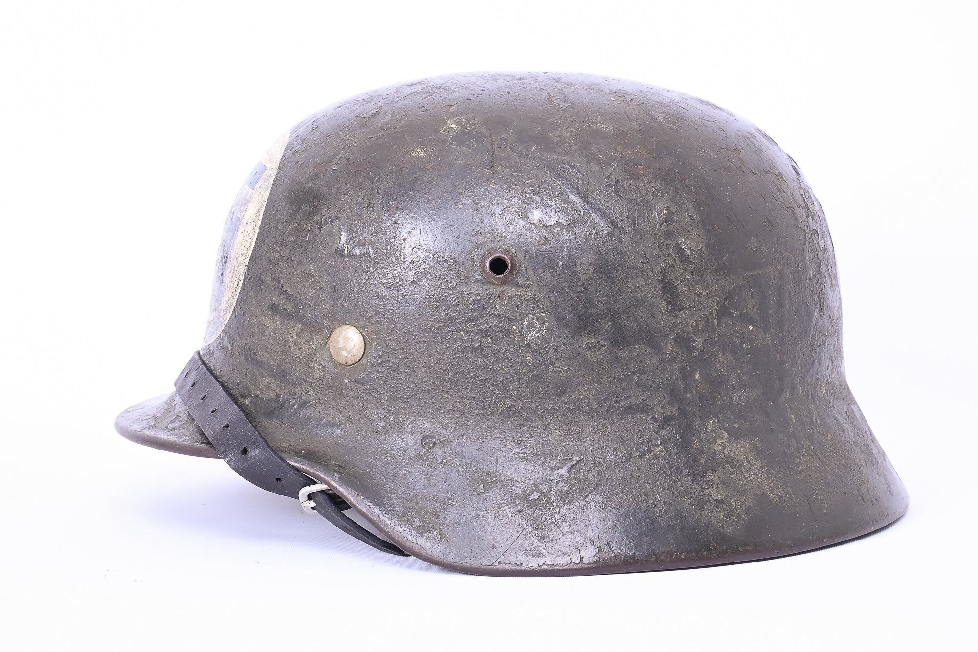Interesting M35 helmet featuring a sort of coarse, dark camo layer.Painted inside the helmet itself is the name of the wearer, Fr. Paulus.The movement is still nice and smooth and is still the early aluminium model.The large swastika in a white circle was most likely painted on it by a biker or veteran, because it is from America.It could just as easily be a cool bring-back helmet, but unfortunately I don't have that info... the helmet itself hasn't been messed with... only the chin strap is a copy, the short strap is original though. But that was on this helmet, so I'll leave it on.The helmet itself is an EF: Emaillierwerk AG, Fulda.The decal is still present under the camo.
