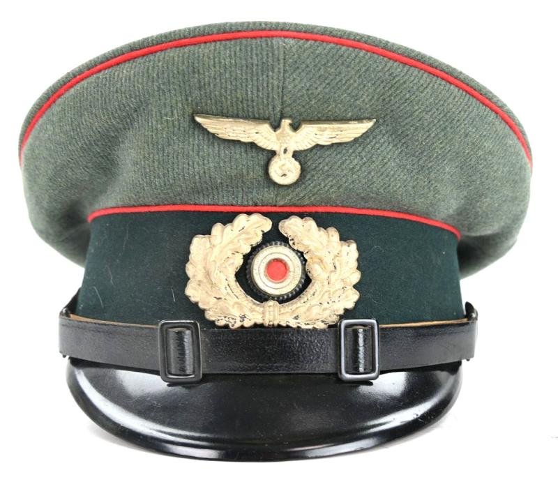 In a very good condition a German Wehrmacht (heer) Enslisted Men / NCO Visor Cap.The cap comes in size 54 and has only very light traces of wear.It contains the red branchcolour indicating use by a member of the Artillery Troops.Inside the sweatband collar is the cap maker marked and 1936 dated.The cap has it's insignia original applied.A very nice shaped cap!