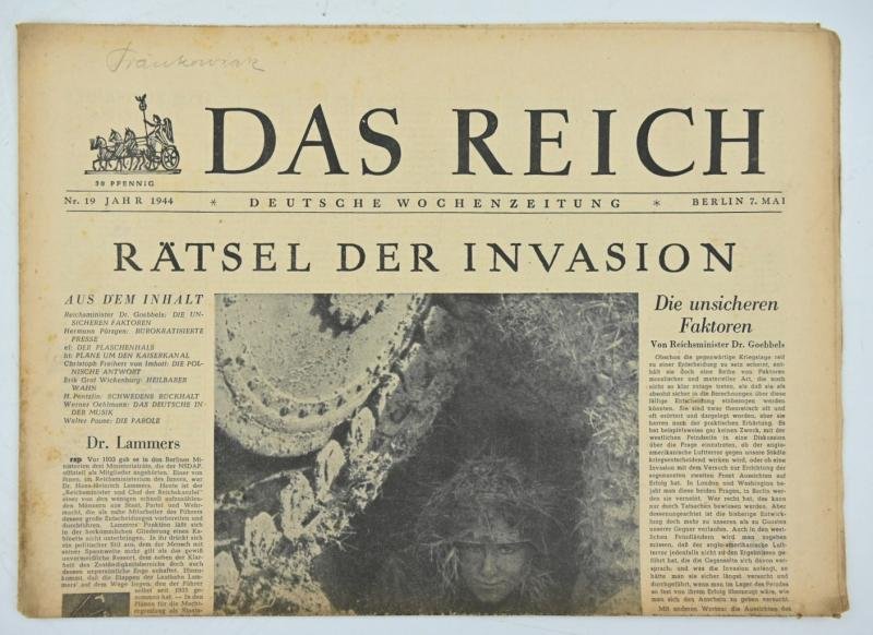In a very nice condition a German Newspaper 'Das Reich' dated 7 May 1944.The paper comes with a very nice header.