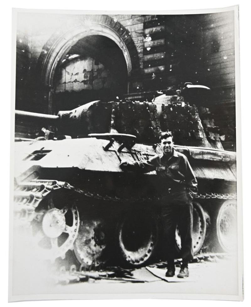 In a very good condition a US WW2 Press Photo of an american soldier posing for a German Panther tank in Berlin after the defeat of Nazi Germany.The picture comes in a size of approx 20x25cm.