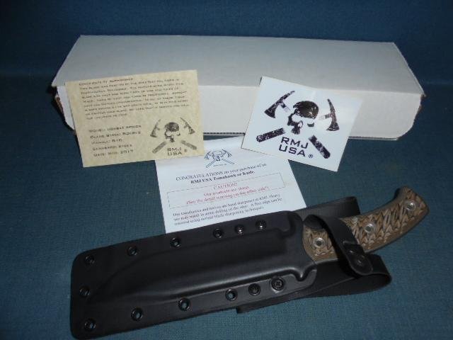 This is a solid knife with a 7' satin-coated clipped blade stamped RMJ on one side and USA on the otherThe knife is 12' overall with a Hyena brown G10 grip pinned onto the full tang, and the knife comes with its Kydex sheath cert, and box S/n 03130Price includes UK delivery