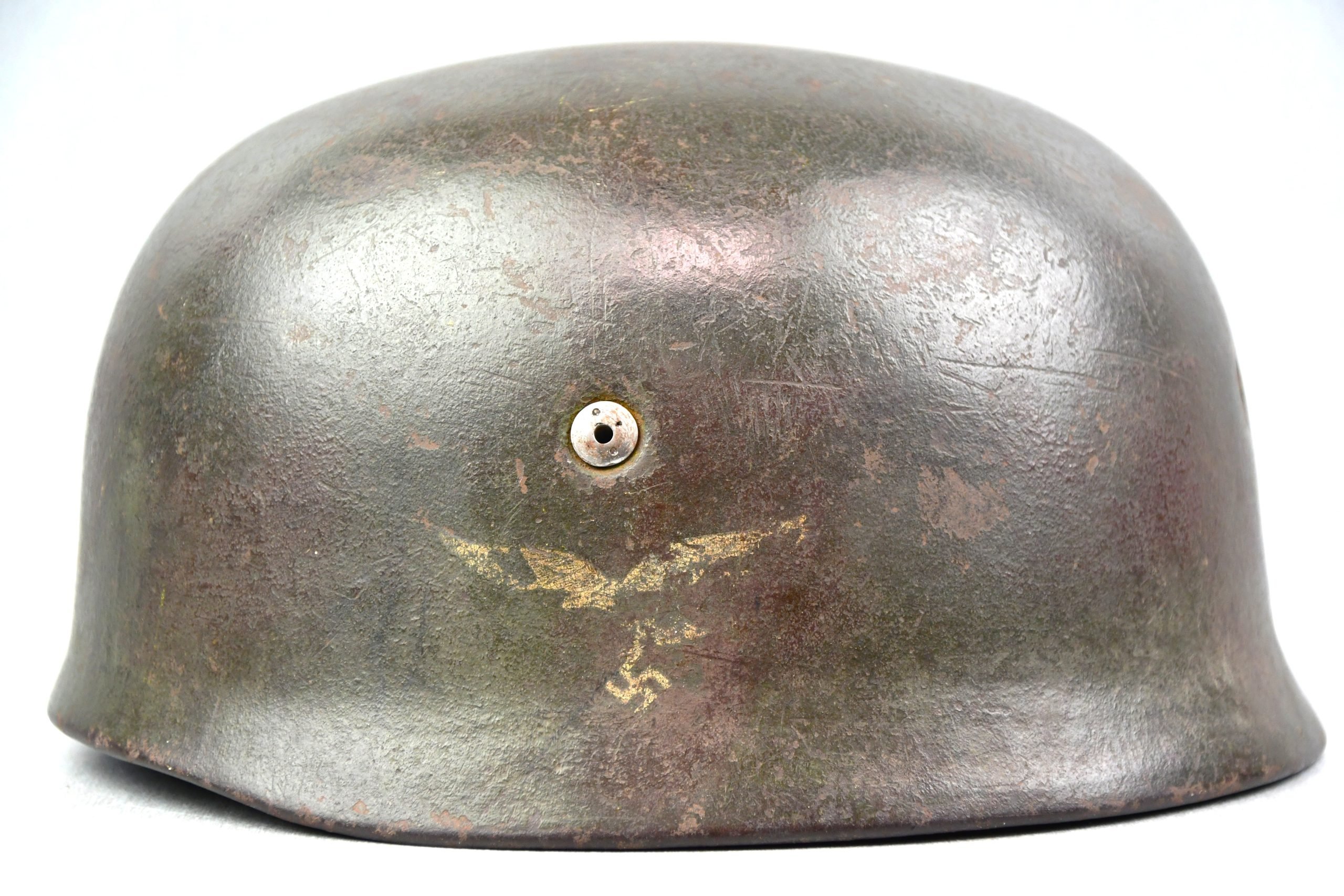 Genuine mid-war constructed single decal paratrooper helmet. Outside has been painted/camouflaged in green and red/brown stripes and colors. The original Luftwaffe decal is still present, partially covered in camo paint. The bolts that are present are replacements and not genuine – but i left them there anyway. Aluminum liner band is present and original. Liner itself is not present. Shell markings ET68 – 2255. A very honest untouched helmet!