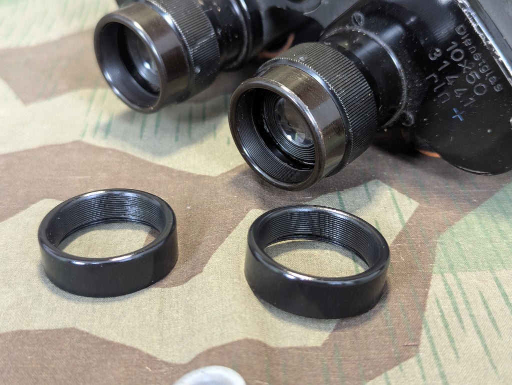 A Kriegsende classic product has new life as a 3D print. These eye pieces were drawn from an original set and printed in black resin. The threads fit the original 10x50 Dienstglas (these are the bigger binoculars). These are very detailed resin prints which have been coated to give the finished eyepiece a nice finish. I am very happy with how these turned out, I think they are actually better than the toaster-lite repros I made a decade ago (yes, my first ones were made in a modified toaster oven, super classy, very professional).Price is for one pair.I only have 2 pairs of 10x50 binoculars in my collection and these fit both, but I can not rule out the possibility that there might be variations based on manufacturers but I believe these will fit virtually all German 10x50 type binoculars and probably a few other things and the thread size was actually fairly standard.