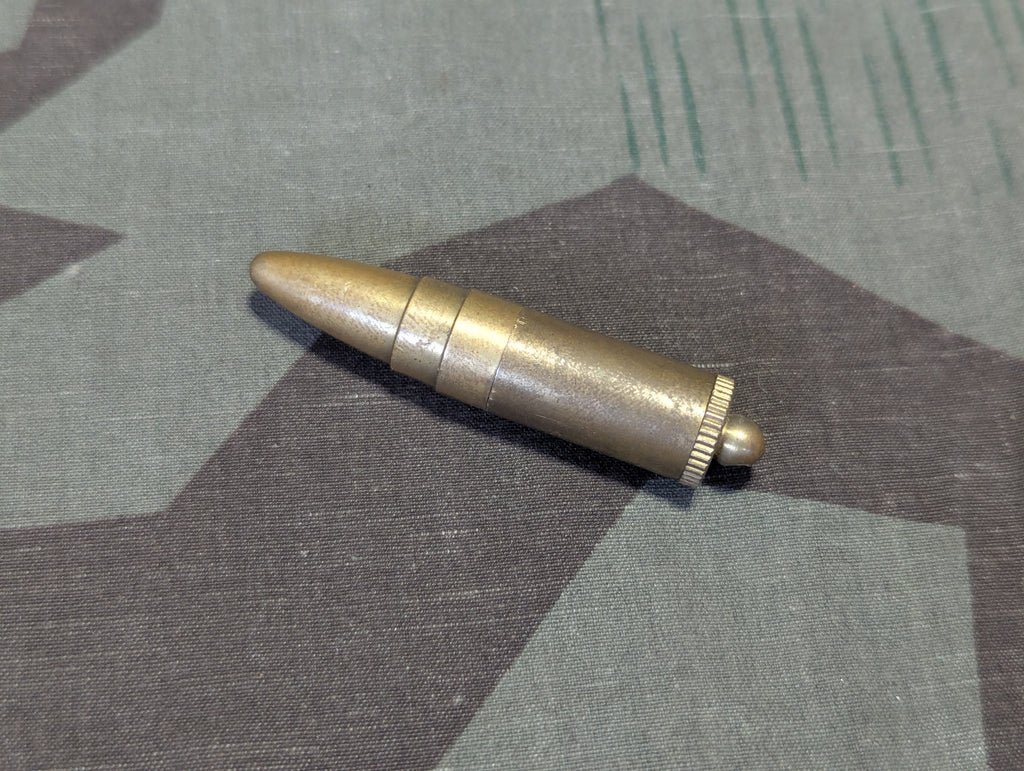 Small bullet shaped lighter in good condition and in working order. Just add fuel. This is much more finely crafted than many of the lighters I see. Both the cap and the bottom plug are threaded. It does have a flint and did spark when I tried it.