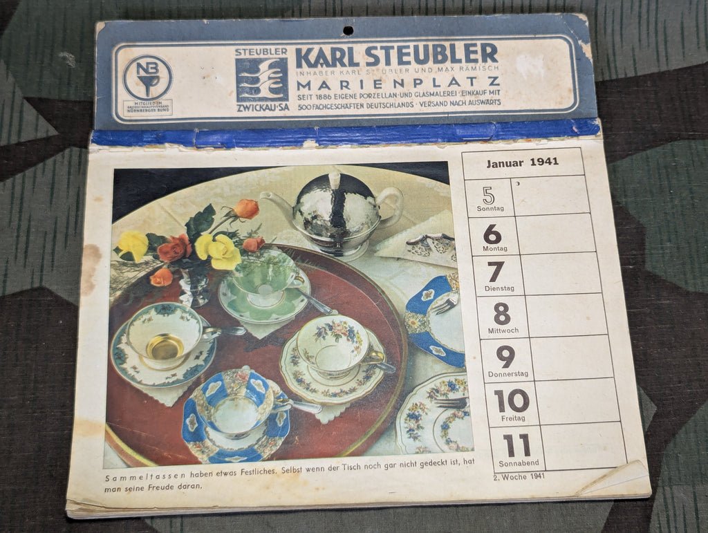 Interesting original 1941 advertising wall calendar. It has a picture on each page, mostly of normal everyday household goods which this particular company sold, but I find they very interesting mostly because I have seen so much of it at flea markets over there. Some of the stuff has a very modern look. Good item for reference or also a nice decoration for the kitchen. It does appear to be missing at least the first page as it starts on January 5th.