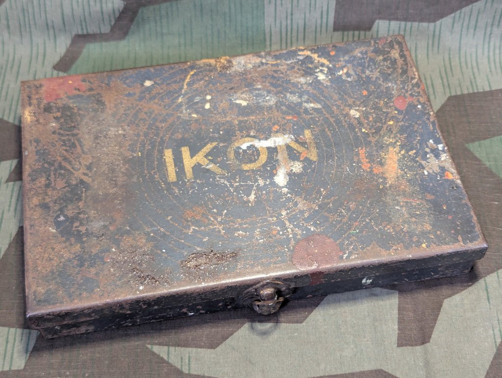 Heavy steel box in panzer gray paint marked IKON. I am not entirely sure what this is for, but it is likely for some form of camera accessories. Its fairly worn and dirty. Would be a good addition to a kriegsberichter set up.
