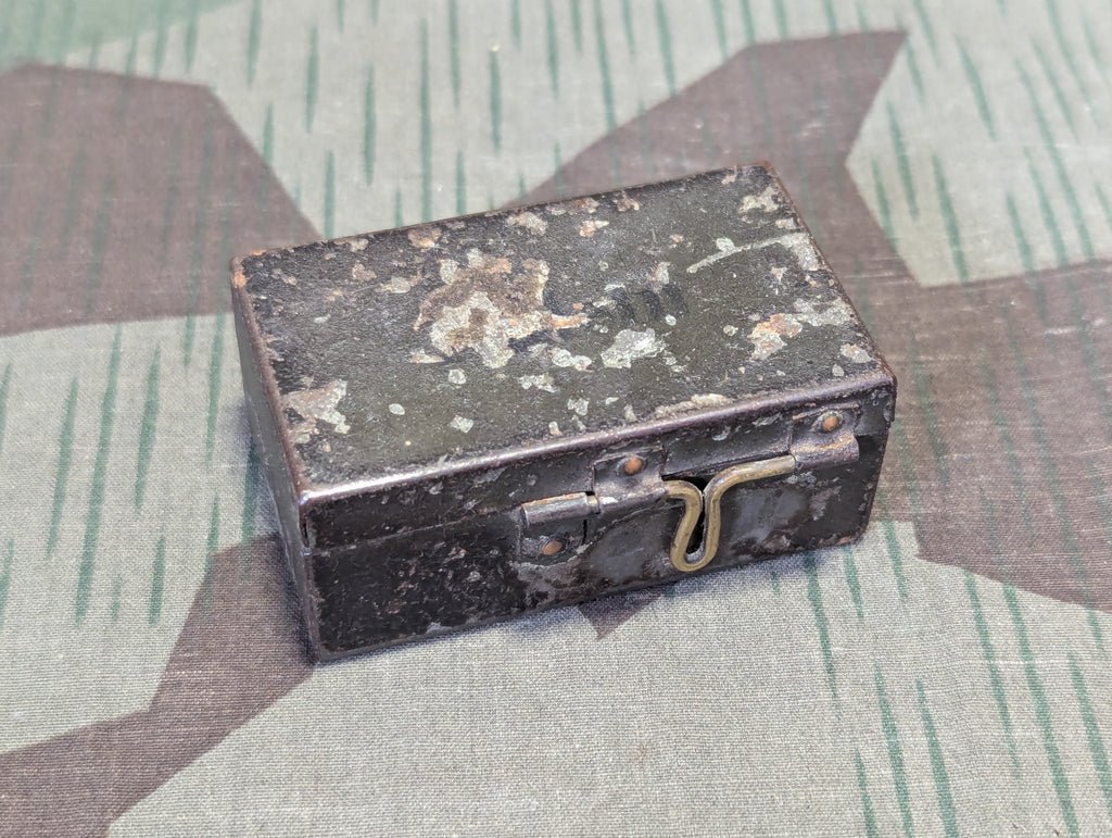 Original German wehrmacht or DRK needle tin. This would have been found in a large variety of medical kits. Printed 'Nadeln' on one side. Has wear. Visually its a little rough, but structurally its pretty good.