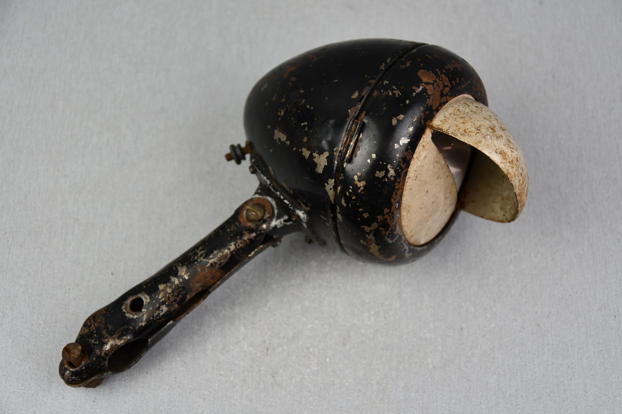 Very nice and genuine Wehrmacht bicycle 'Truppenfahrrad'front light in original black and white paint. Maker marked by Nirona.